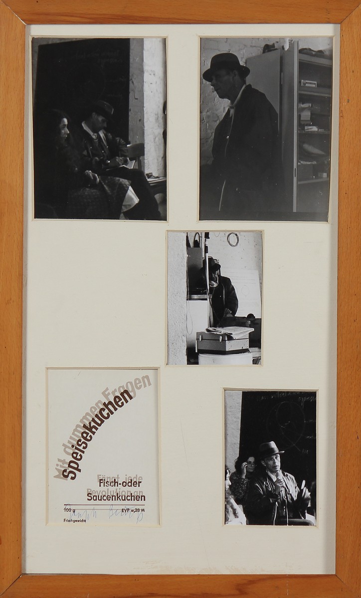 BEUYS JOSEPH (1921 - 1986) Speisekuchen. 1977. Tecnica mista su cartone. Cm 30,00 x 50,00. Lotto composto da quattro fotografie, di cui due di cm 17x12 e due di cm 12.5x9, raffiguranti l'artista durante la mostra - One Hundred Days of the Free International University - tenuta a Kassel in occasione di Documenta 6 e una cartolina a tiratura illimitata firmata a biro prodotta dall'artista durante Documenta 6 nel 1977 (Joseph Beuys Multiples, Shellman, Tav. 180), Edizioni Staek, Heidelberg. . Cornice presente