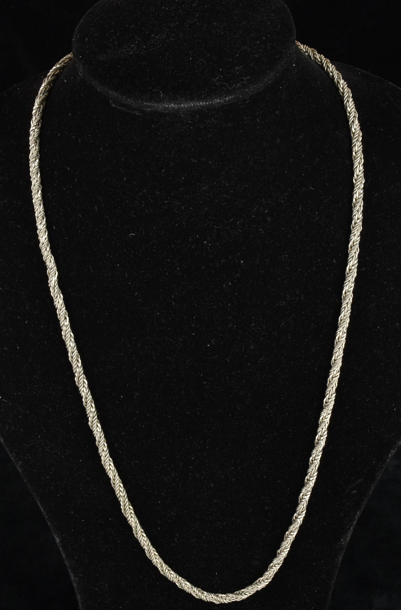 COLLANA IN METALLO ARGENTATO a fili multipli intrecciati Italia, anni '70 32 cm