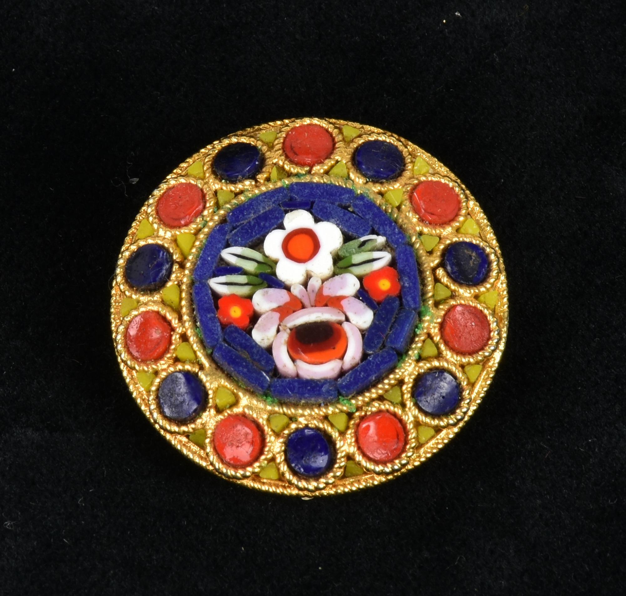 Lot 256 | SPILLA IN METALLO DORATO CON MICRO MOSAICO raffigurante mazzo di fiori...