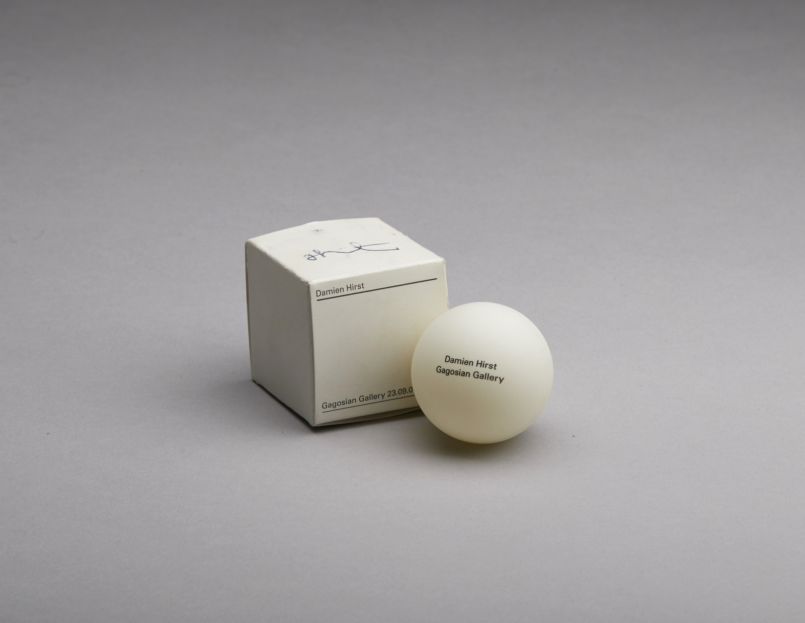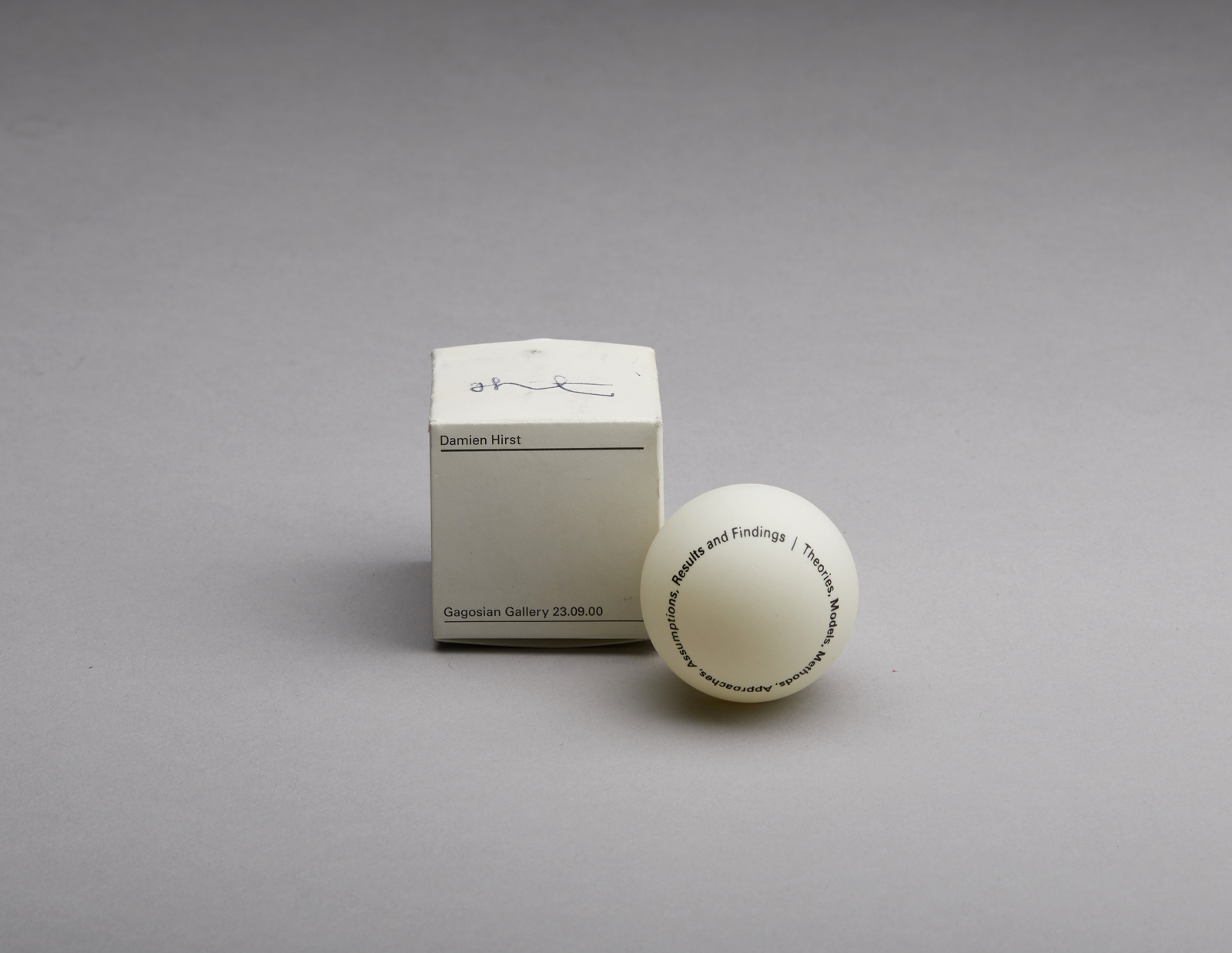 HIRST DAMIEN (n. 1965) Invito all'esposizione di Damien Hirst alla Gagosian Gallery, New York. . 2000. Multiplo su pallina da ping pong, carta e cartoncino. Cm 4,00 x 4,00 x 4,00. Firma a penna su contenitore. Questa pallina da ping pong serviva come invito per la preview della sua mostra del 2000 "Theories, Models, Methods, Approaches, Assumptions, Results, and Findings" alla Gagosian Gallery di New York. È una pallina da ping pong di dimensioni standard con i nomi dell'artista e della galleria su un lato e il titolo della mostra sull'altro. È contenuta in una scatola con i nomi dell'artista e della galleria sul coperchio e la data di apertura della mostra. All'interno della scatola è presente un foglio di carta che spiega il processo che avviene dopo la morte su un lato e un elenco dei centri antiveleni negli Stati Uniti sull'altro lato.