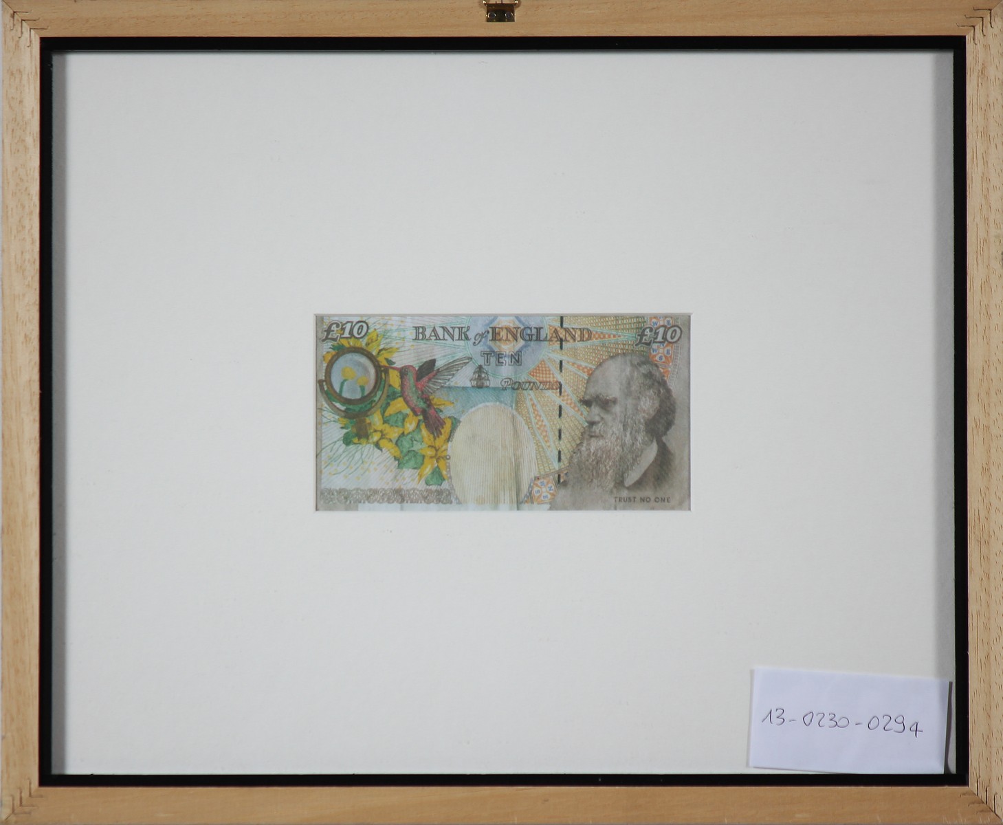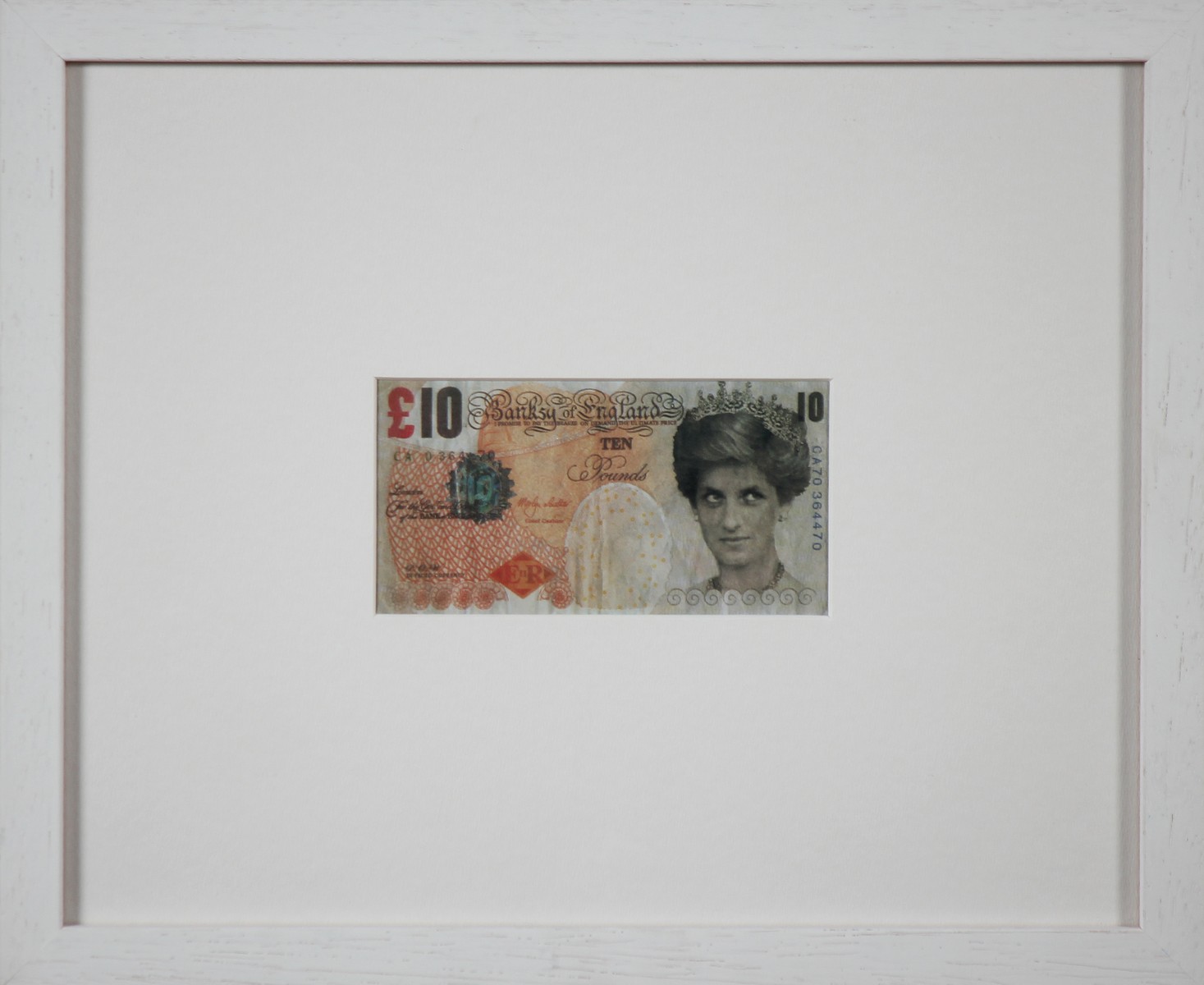 BANKSY (n. 1975) Senza titolo. Tecnica mista su carta. Cm 14,00 x 7,00. Banconota da 10 pounds. Cornice presente