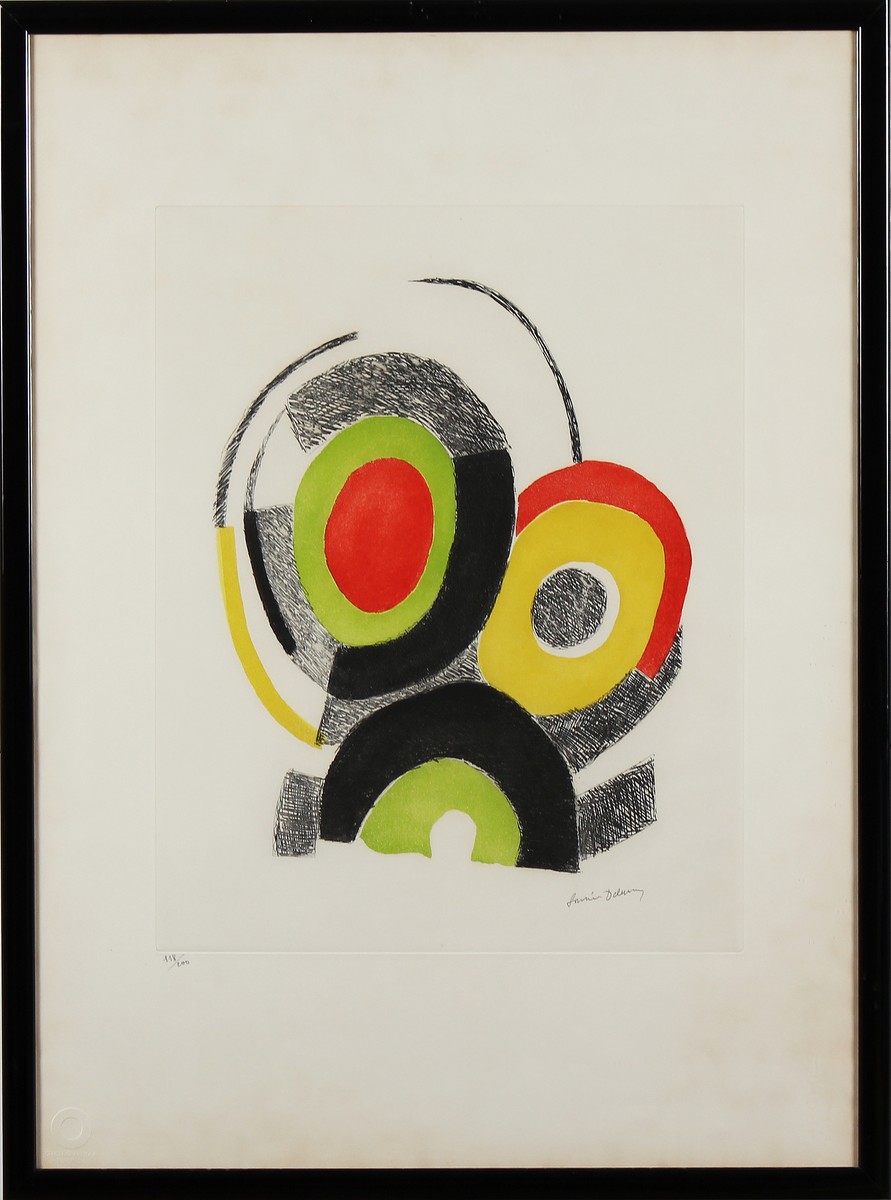 DELAUNAY-TERK SONIA (1885 - 1979) Senza titolo. Acquaforte. Cm 56,00 x 76,00. Misure lastra:49,5x39cm. Tir. 118/200 e firma in basso a matita. Timbro a secco Cercle Graphique Europeen in basso a sinistra. Cornice presente