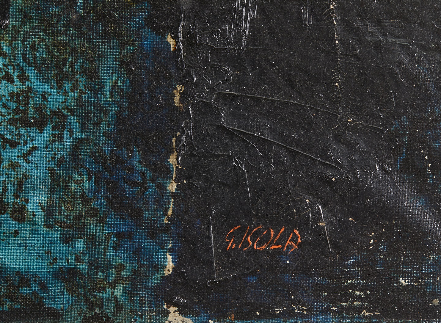 ISOLA GIANCARLO (n. 1927) Vecchie case. Olio su tela . Cm 120,00 x 90,00. Firma in basso a destra. Al retro titolo e cartiglio descrittivo della XI Mostra Nazionale di Arti figurative, Avezzano.