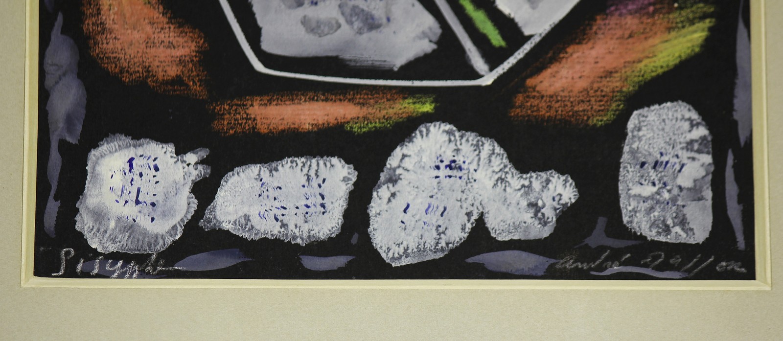 MASSON ANDRE' (1896 - 1987) Sisyphe. 1954. Gouache su cartoncino nero. Cm 20,50 x 25,00. Firma in basso a destra. Titolo in basso a sinistra. Al retro a matita -Sauret 343.BB. Pezzo unico. Autentica su fotografia della Galleria D'Arte Angolare - Milano con relativo numero d'archivio. Cornice presente