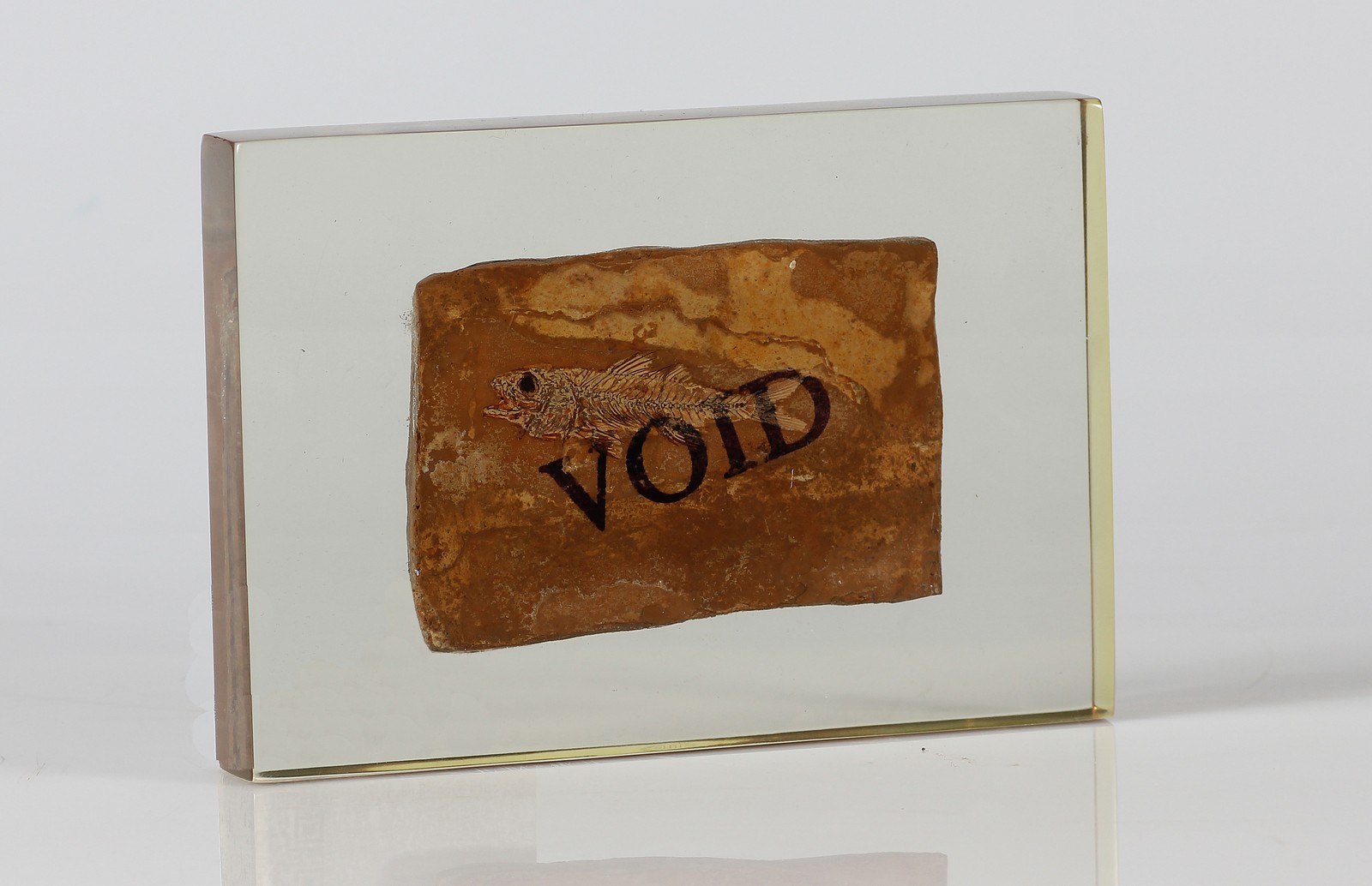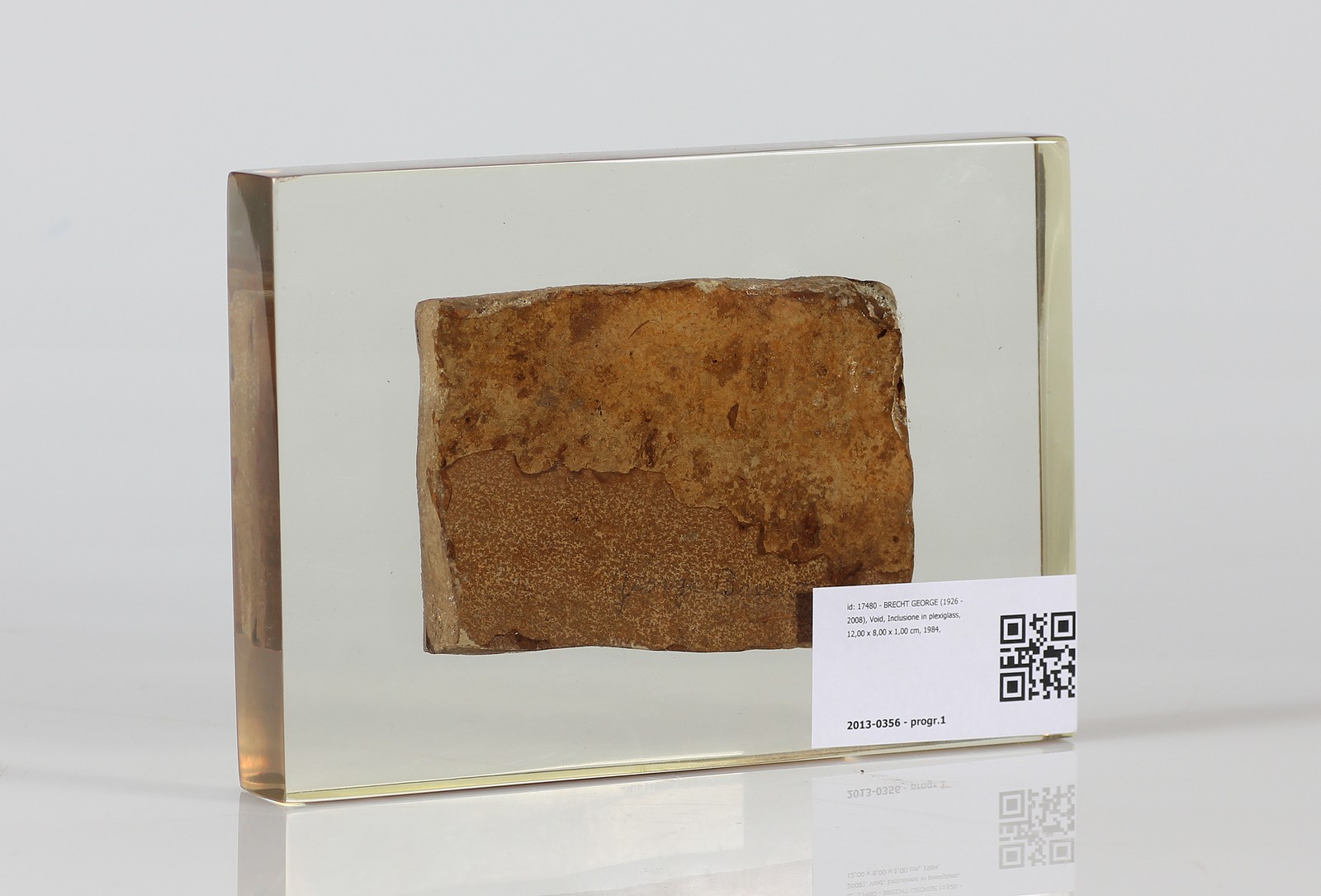 BRECHT GEORGE (1926 - 2008) Void. 1984. Inclusione in plexiglass. Cm 12,00 x 8,00 x 1,00. Reperto fossile timbrato sul fronte e firmato a matita sul retro. Dimensioni Plexiglass: cm 19,5x13,5x3. Sotto la base reca il timbro dell' Archivio Francesco Conz, Verona.