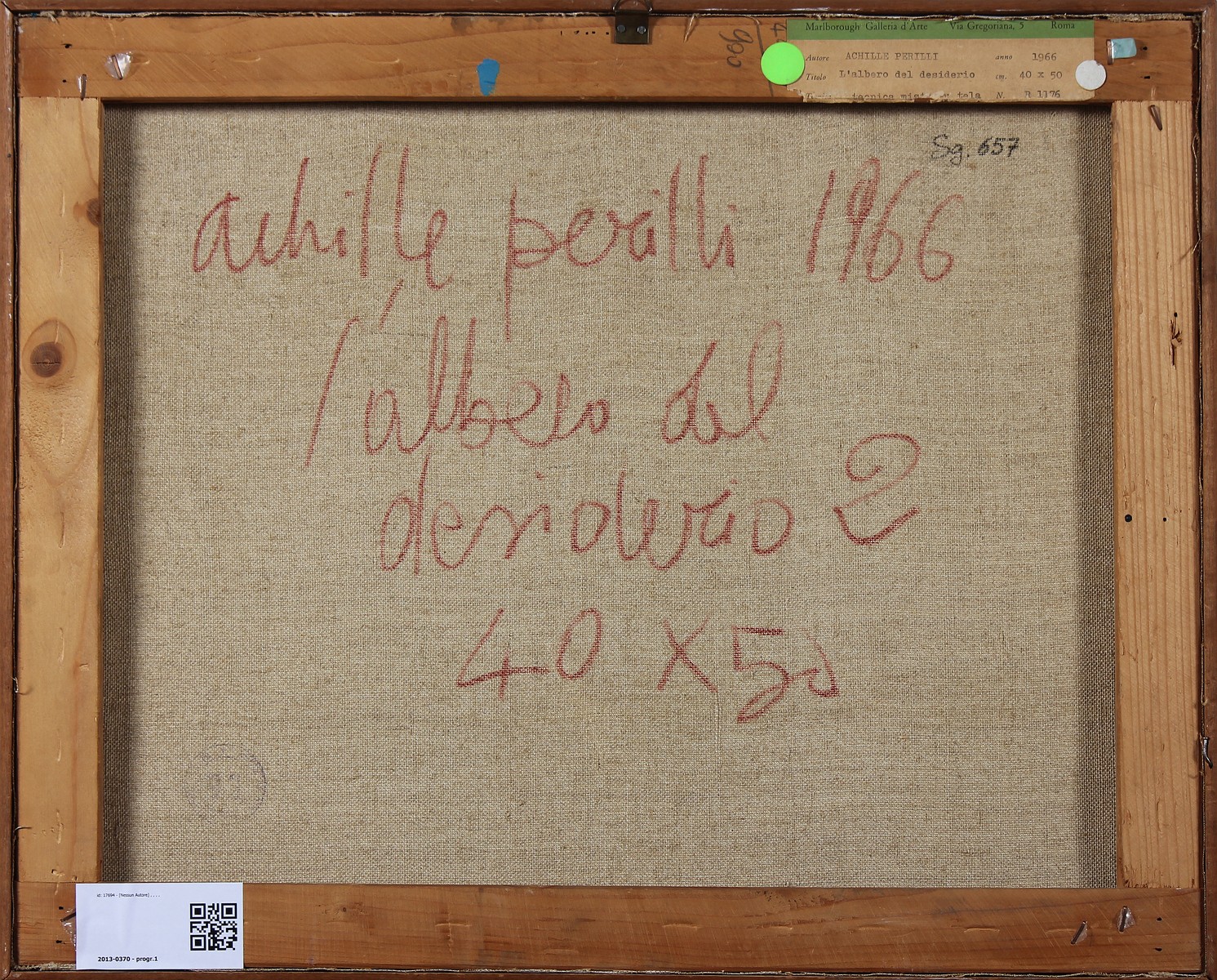 PERILLI ACHILLE (n. 1927) Albero del desiderio 2. 1966. Tecnica mista su tela. Cm 40,00 x 50,00. Firmato e datato 1966 in basso a destra e al retro, Al retro etichetta della Galleria Marlborough riportante numero di inventario r 1176. Opera archiviata presso l'archivio Perilli come da documentazione fotografica allegata all'opera riportante il relativo numero d'inventario e la firma dell'artista.