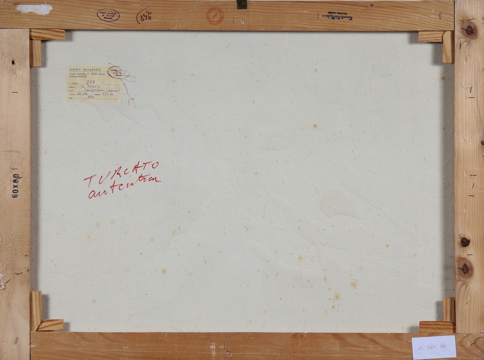 TURCATO GIULIO (1912 - 1995) Composizione. Tecnica mista su tela. Cm 80,00 x 60,00. AL retro firma per autenticità e cartiglio dello Studio Mirabello, Milano. Opera pubblicata sul volume - Giulio Turcato - a cura di Flaminio Gualdoni, Edizioni Essegi, pag. 17.
