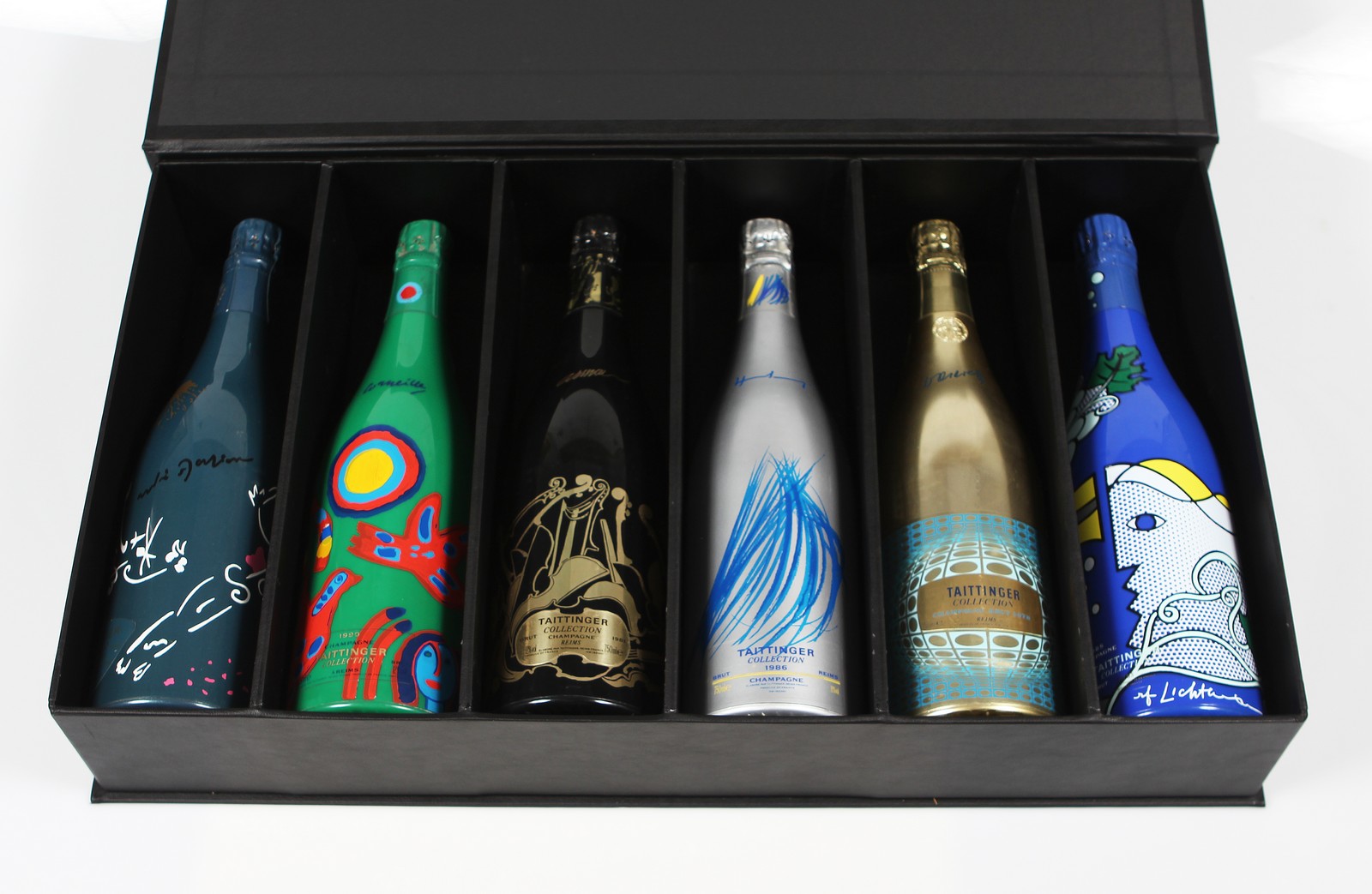 AUTORI VARI Sei bottiglieTaittinger Art Collection. . . Confezione originale Taittinger. Sei bottiglie di ChampagneTaittinger in edizione limitata il cui design è stato curato per ognuna da un differente artista: Andrè Masson, Corneille, Arman, Hans Hartung, VictorVasarely e Roy Lichtenstein.