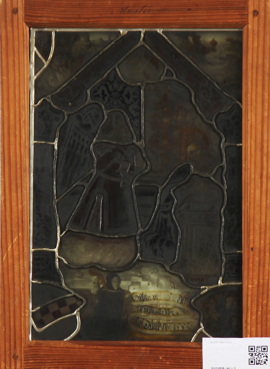 MANIFATTURA TEDESCA DEL XVI SECOLO Annunciazione. Olio su vetro con inserti in piombo. Cm 22,00 x 32,00. Felatura all'altezza di Maria. Germania del XVI secolo. Vetro colorato raffigurante un'Annunciazione; la Vergine è inginocchiata sulla destra ed un angelo in piedi accanto a Lei le annuncia la buona novella. In alto un filatterio riporta Ave Maria gracia Dominus terim. Nella parte bassa un altro filatterio, accanto ad un personaggio in ginocchio, riporta la data 1553. . Cornice presente