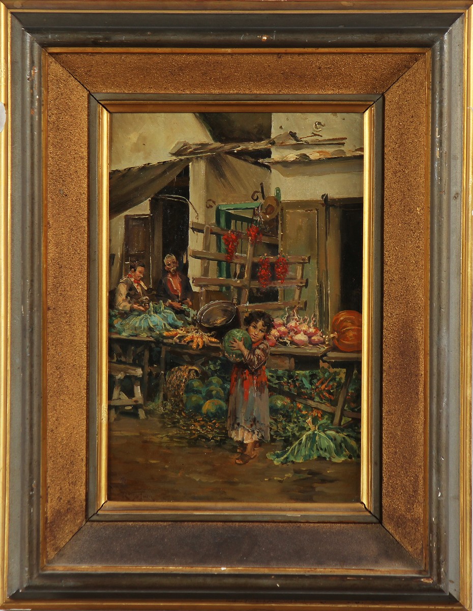 TAFURI RAFFAELE (1857 - 1929) Mercato con personaggi. Olio su tela . Cm 31,50 x 20,50. Firmato in basso a sinistra. Cornice presente