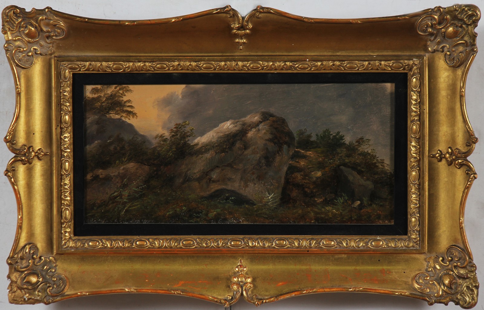 CANELLA GIUSEPPE (1837 - 1913) Studio di montagna: rocce, vegetazione e nuvole. Olio su cartone pressato. Cm 34,70 x 16,50. Datato alla metà degli anni quaranta, fa parte del gruppo di opere che ritraggono zone del Trentino, del Tirolo, del lago Maggiore spesso rappresentati in quegli anni dall'artista. In particolare il presente dipinto può essere accostato allo Studio di montagna pervenuto nel 1883, con altre opere dello stesso genere, ai Civici Musei di Brescia con il legati del pittore paesista Giovanni Renica. L'opera è accompagnata da una scheda di Fernando Mazzocca. Bibliografia di riferimento: M. C. Gozzoli, F. Mazzocca (a cura di), Taccuini inediti di Giuseppe Canella, Milano, Stanza del Borgo, 1981. M. Mondini (a cura di), Giuseppe Canella 1788 - 1847. Paesaggi e vedute nei Civici Musei di Brescia, AAB Edizioni, Brescia, 1994.