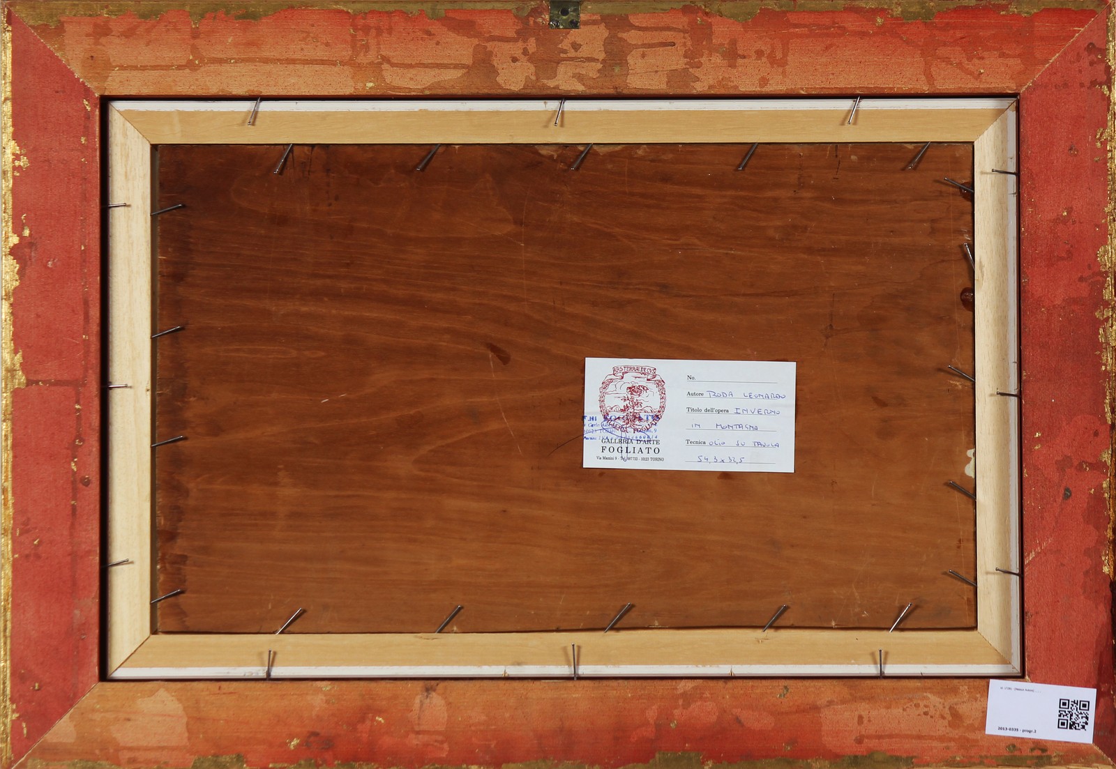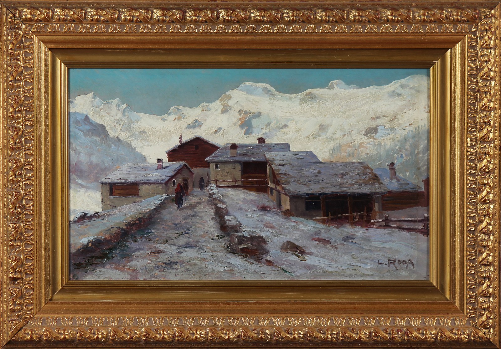 RODA LEONARDO (1868 - 1933) Inverno in montagna. Olio su tavola. Cm 54,50 x 32,50. Firma in basso a destra. Al retro cartiglio descrittivo dell'opera a cura della Galleria d'arte Fogliato, Torino. Opera archiviata presso l'Archivio fotografico delle opere Leonardo Roda a cura della Casa delle aste Meeting Art, Vercelli, come da documentazione fotografica allegata riportante il relativo numero d'archivio. Pubblicato in Il valore dei dipinti dell'ottocento e del primo novecento 2009-2010 pagina 741, Allemandi editore. Cornice presente
