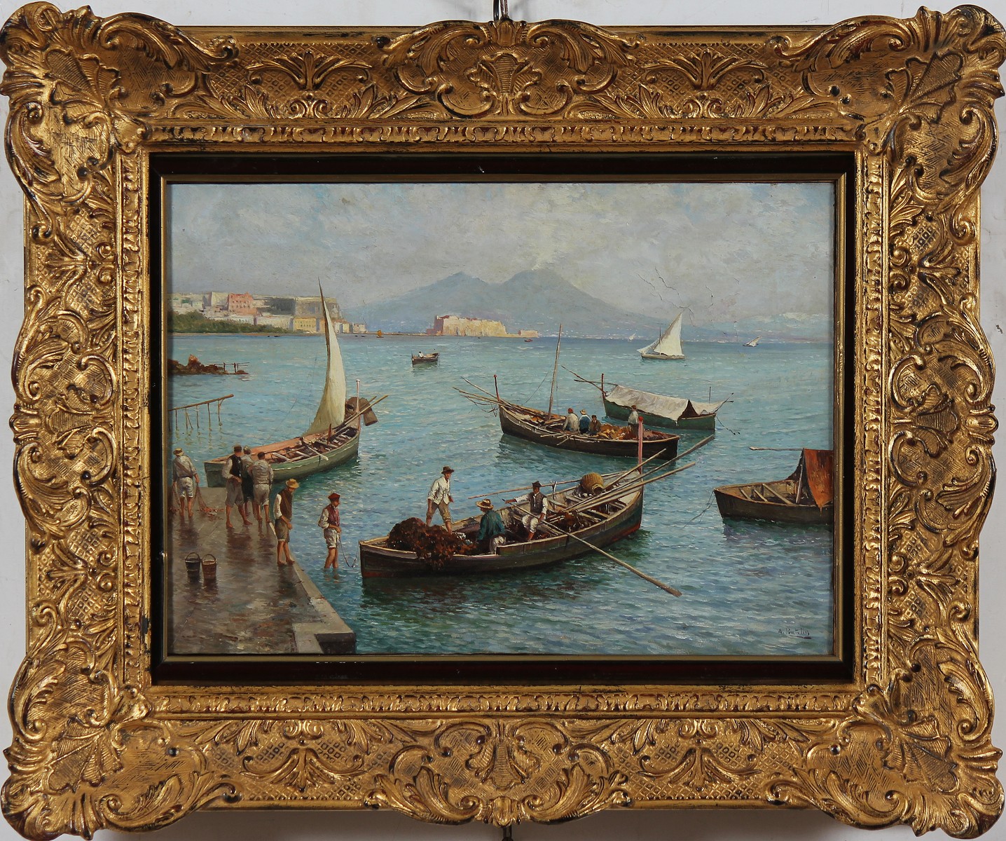 PRATELLA ATTILIO (1856 - 1949) Pescatori a Mergellina. Olio su tela . Cm 40,00 x 2705,00. Firmato in basso a destra. Opera databile alla fine dell'ottocento. Cornice presente