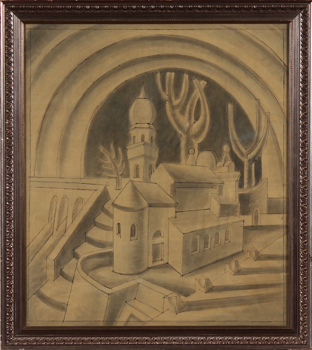 DEPERO FORTUNATO (1892 - 1960) Chiesa di Noriglio. 1952. China su carta. Cm 61,00 x 70,00. Bozzetto per l'omonimo dipinto esposto nella mostra antologicadi Depero a Trento nel 1953. Opera pubblicata su - Depero, edizioni Studio Steffanoni, introduzione di Enrico Crispolti e schede storiche di Maurizio Scudiero, scheda n.37. Cornice presente
