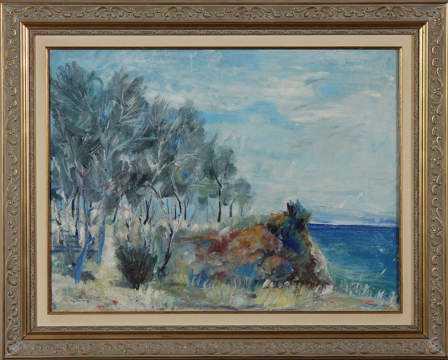 SPILIMBERGO ADRIANO (1908 - 1975) Paesaggio marino. Olio su tela su tavola. Cm 80,00 x 60,00. Firma in basso a sinistra. Cornice presente