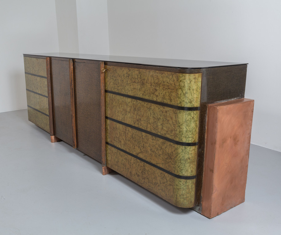 Buxus veneered wood base and sides covered with copper and black opaline top.