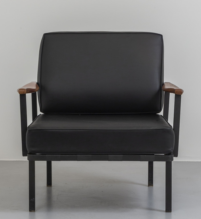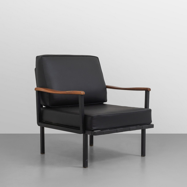 Varnished steel polished wood and vinyl upholstered foam rubber cushions.