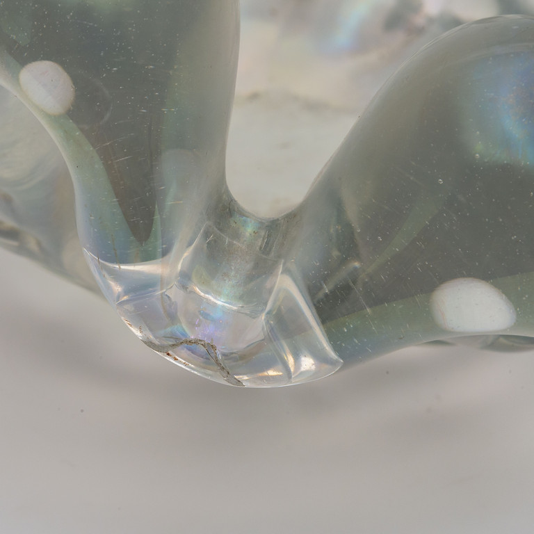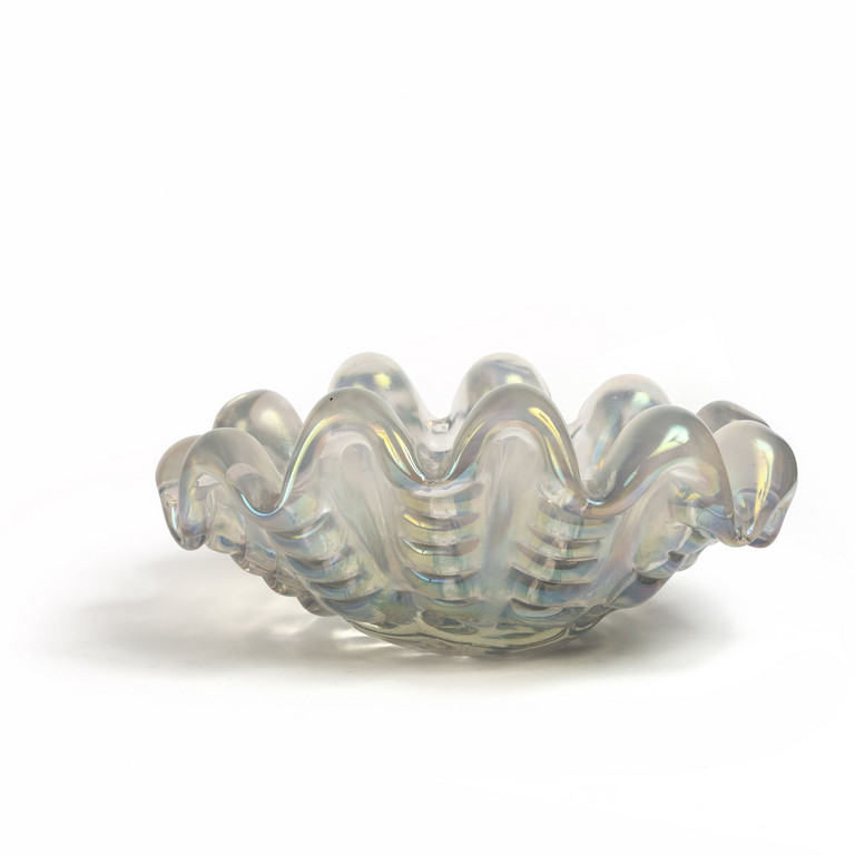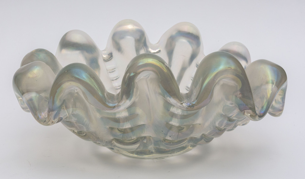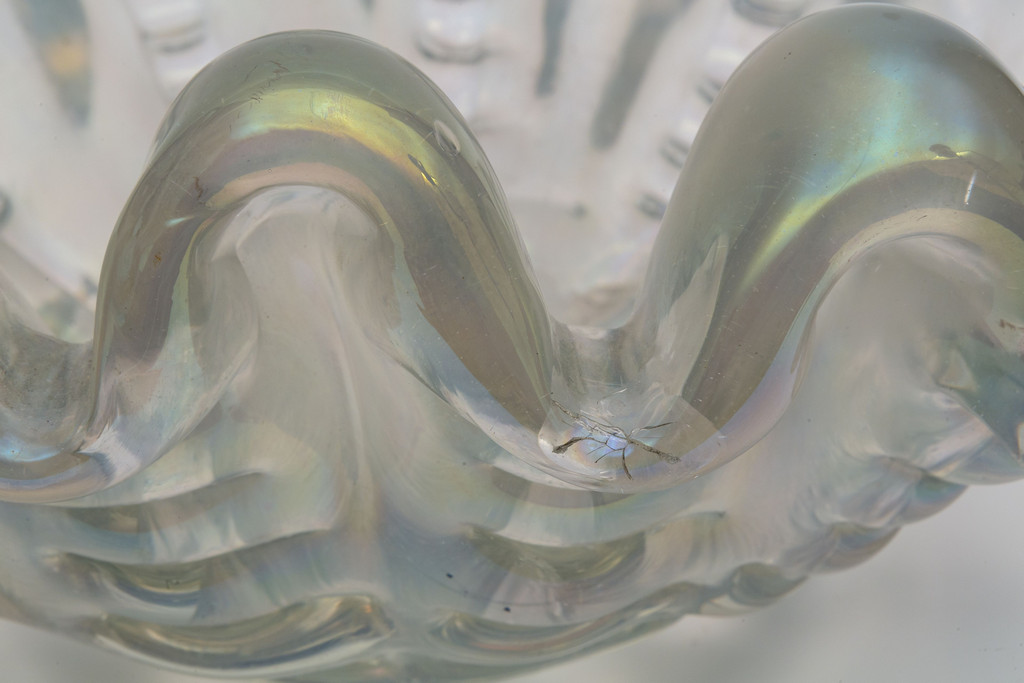una grande coppa a conchiglia in cristallo iridato circa 1942