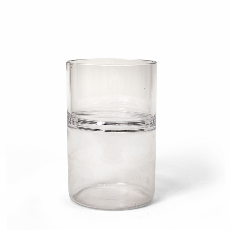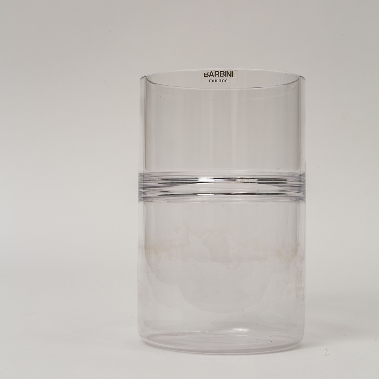 Un vaso cilindrico in cristallo con applicazione mediana di anello interno circa 1990 marca incisa 'barbini murano' etichetta originale