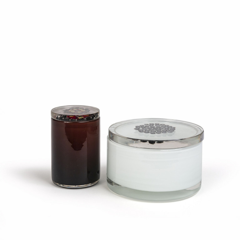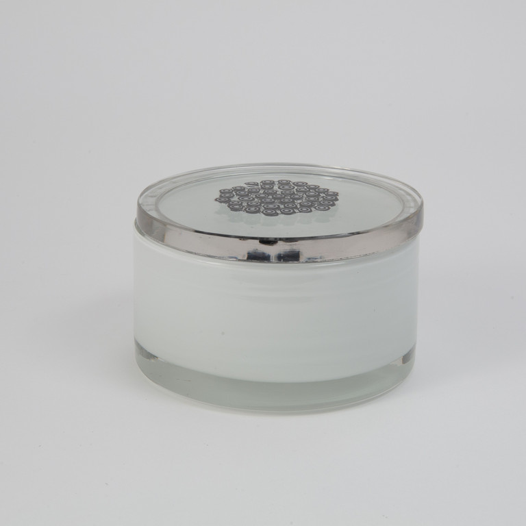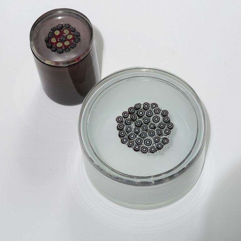 Una scatola cilindrica in vetro lattimo e coperchio in cristallo con murrine bianconere circa 1970
