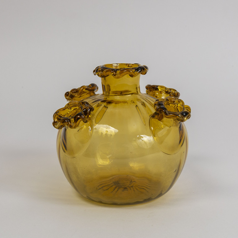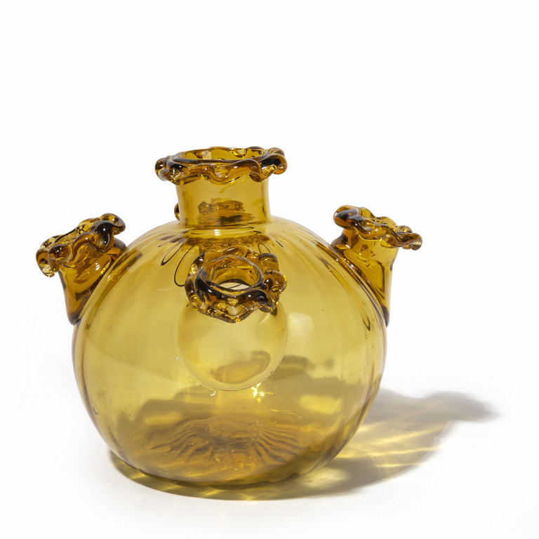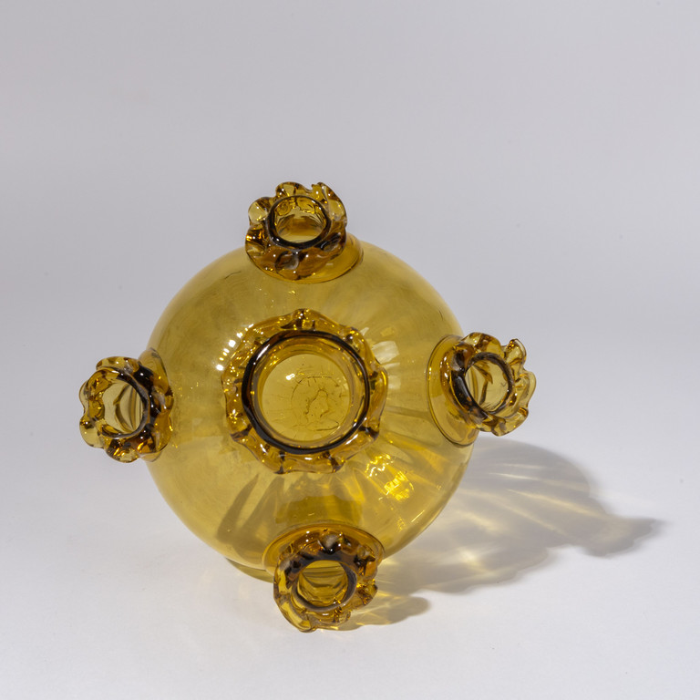 Un vaso in vetro trasparente ambra chiaro costolato e decorato con quattro bocche applicate modello 5185 circa 1925