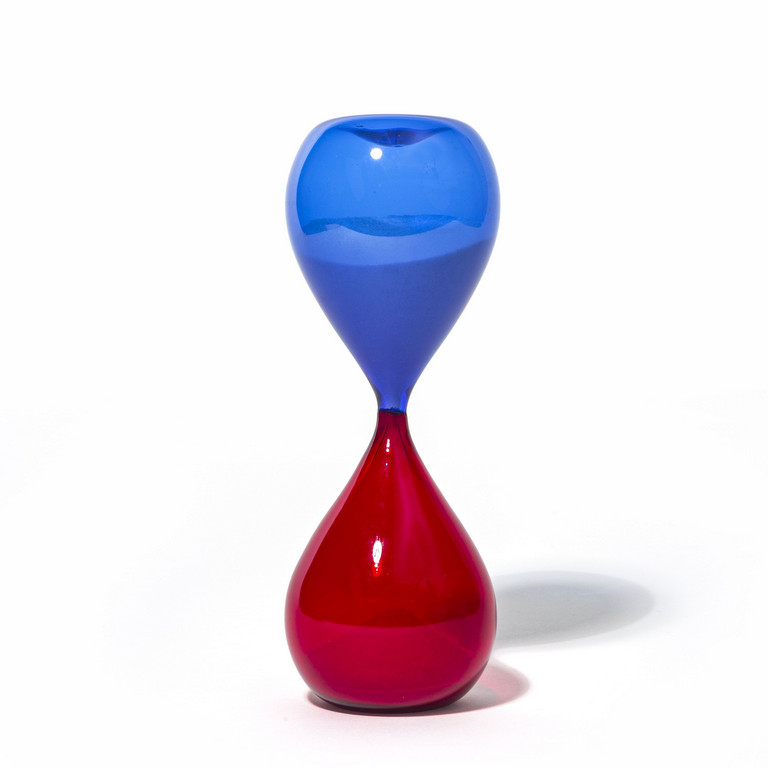 Una clessidra in vetro trasparente rosso e blu modello 4906 1957.