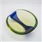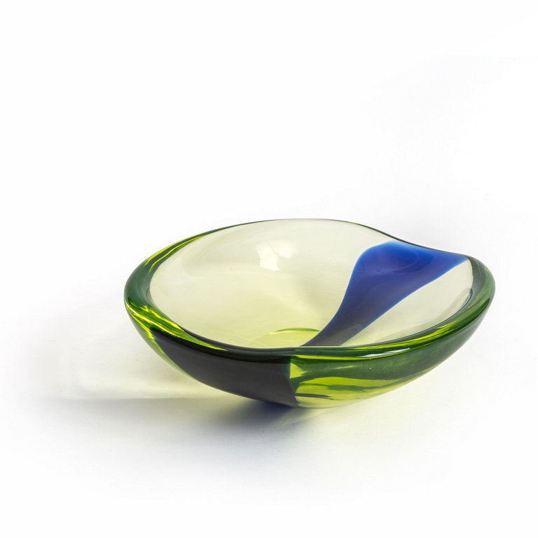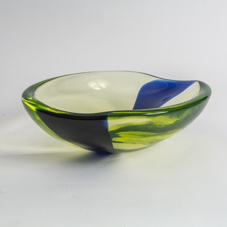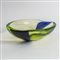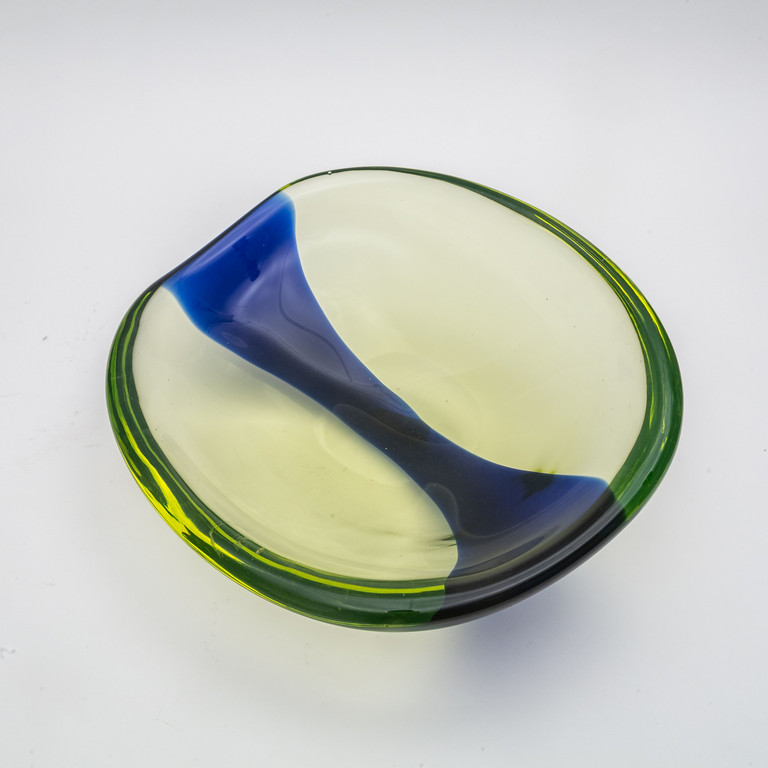 Una coppa in pesante vetro trasparente verdino con decoro di fascia blu sommersa circa 1960