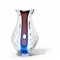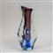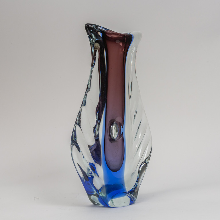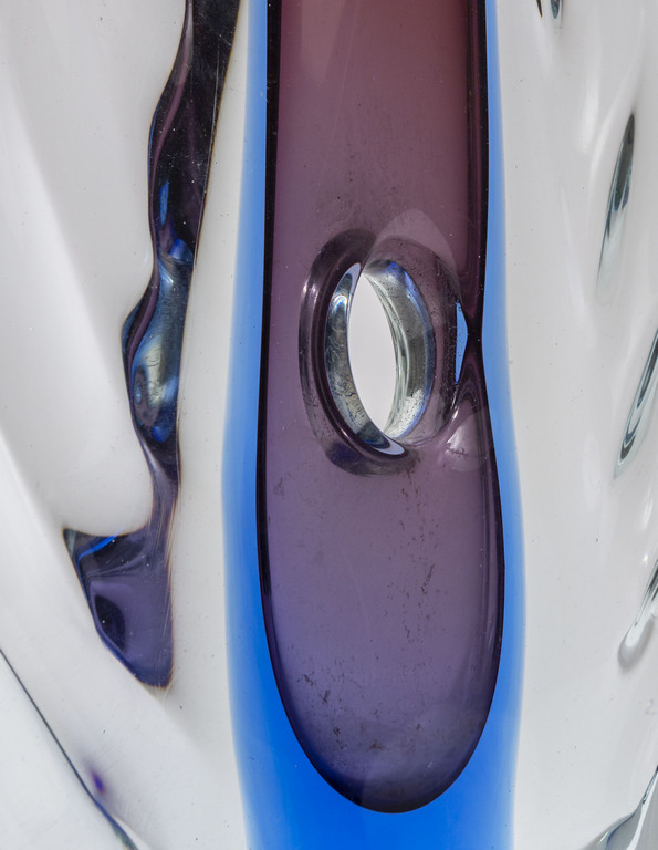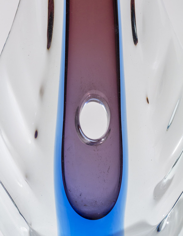 Un vaso in vetro sommerso cristallo blu e rubino con foro centrale e sezione schiacciata