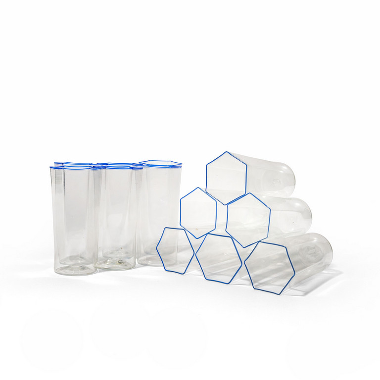 Un gruppo di dodici bicchieri esagonali in vetro trasparente con bordo azzurro circa 1925