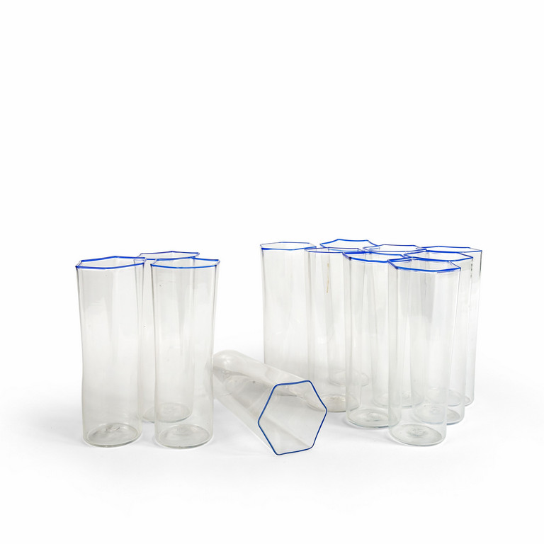 Un gruppo di dodici bicchieri esagonali in vetro trasparente con bordo azzurro circa 1925