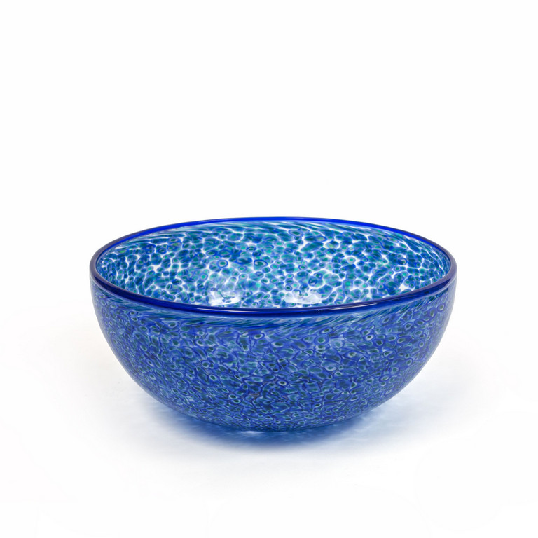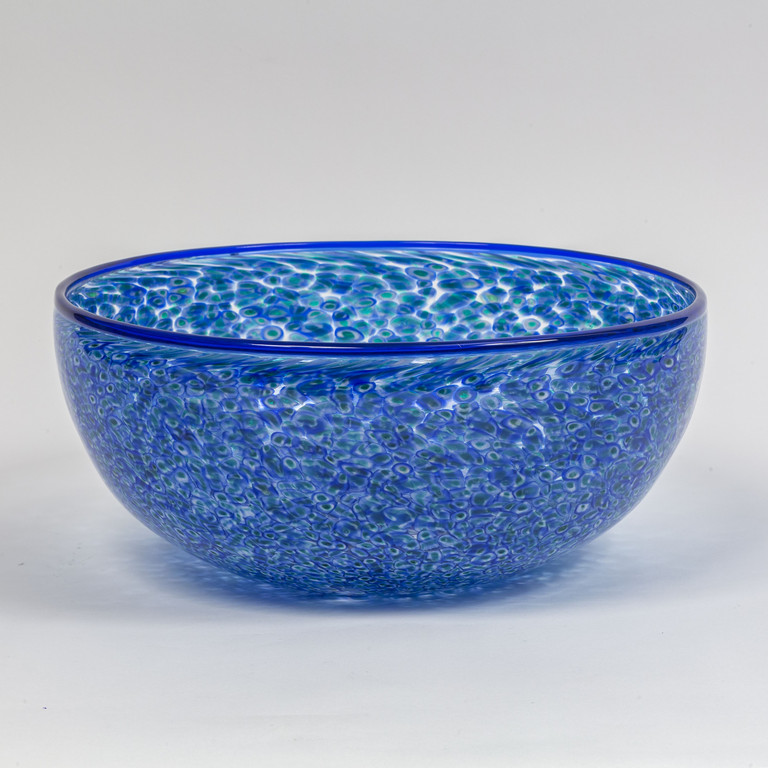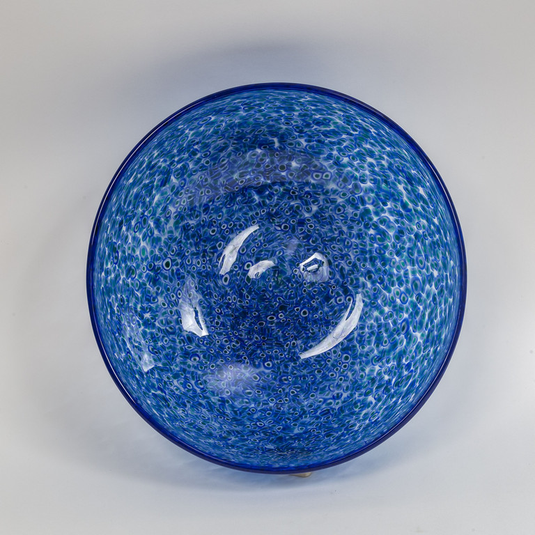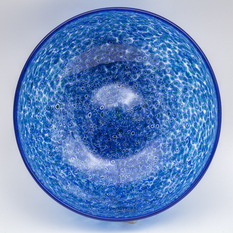 Una grande coppa circolare a murrine sparse color verde lattimo e blu e bordo superiore in vetro blu trasparente circa 1965 marca incisa 'vistosi'