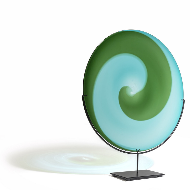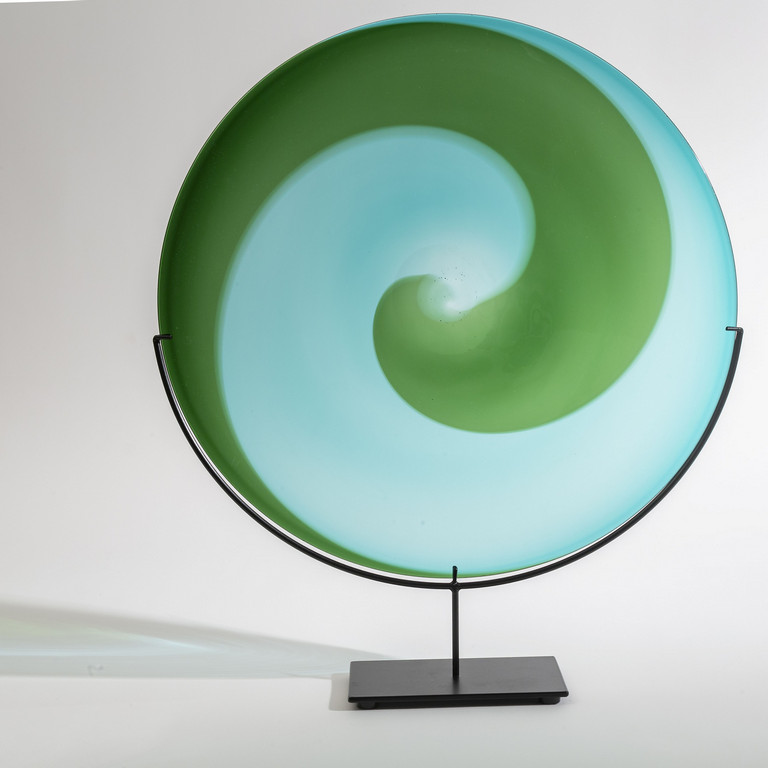 Un piatto della serie 'coreani' a larghe fasce ritorte acquamare e verde circa 1970 Marca incisa 'venini italia tw'