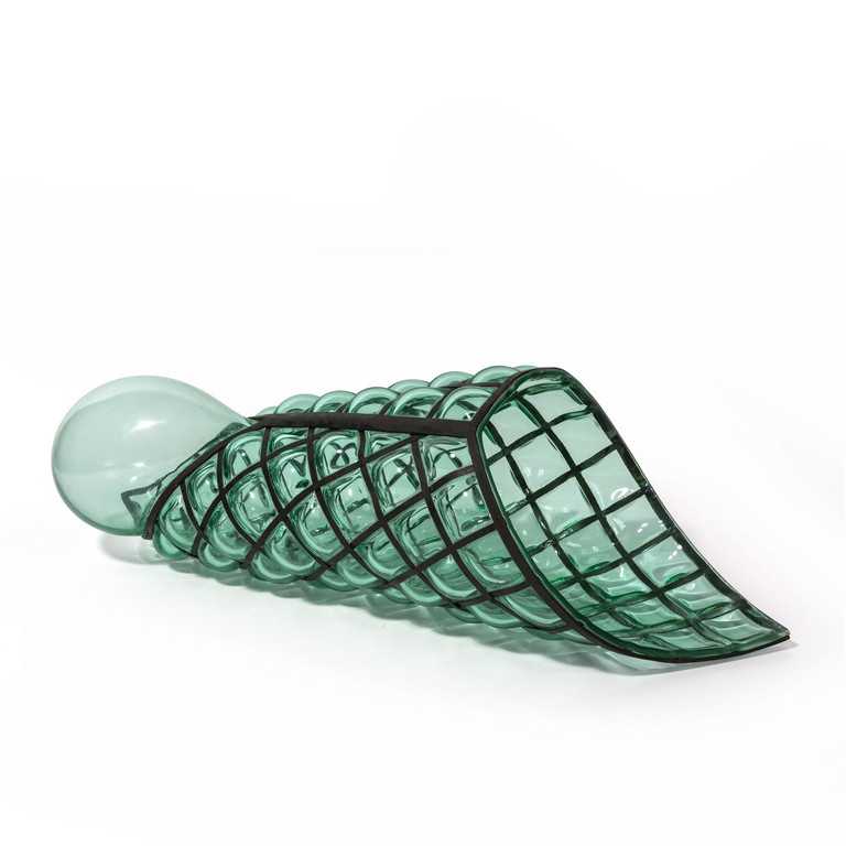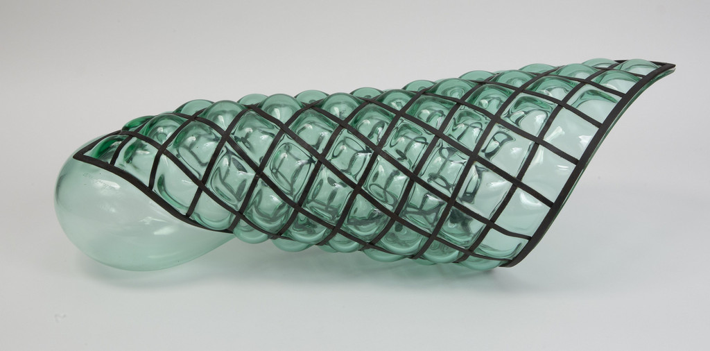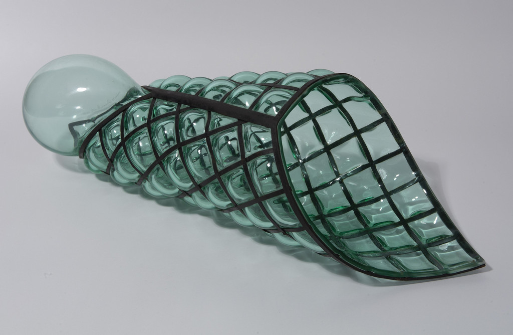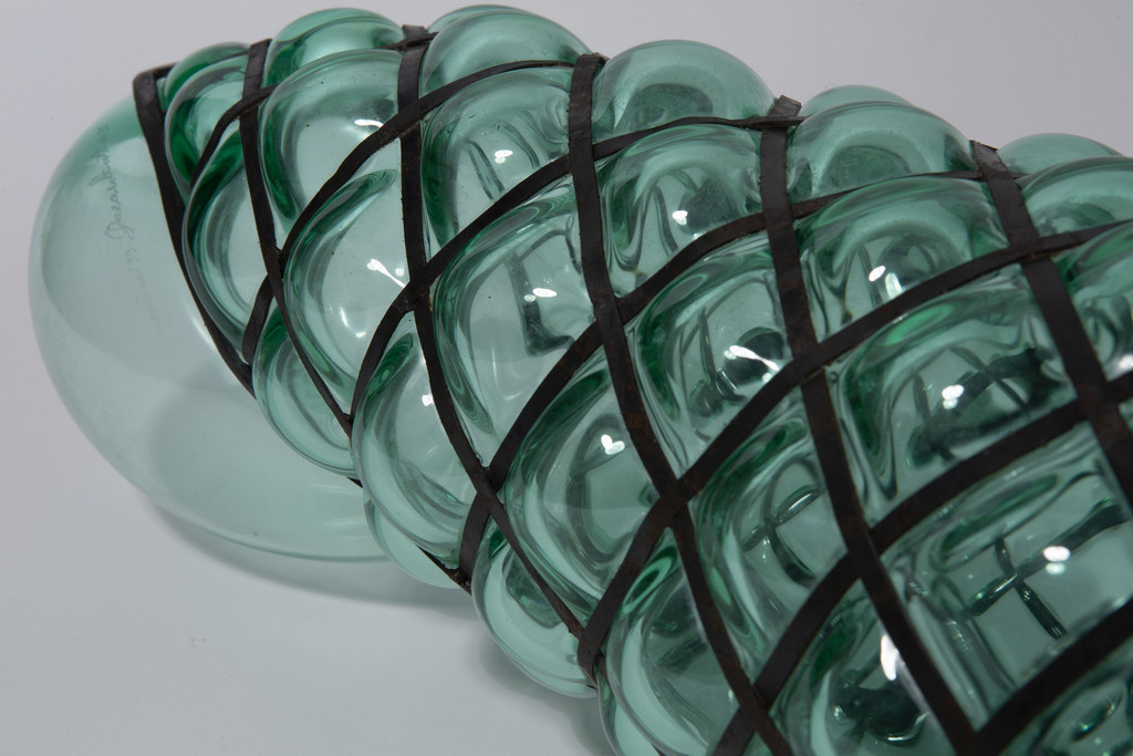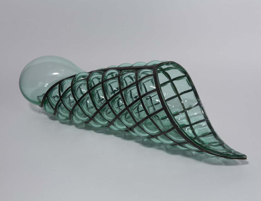 Una scultura 'ritorto' a cornucopia in vetro soffiato entro gabbia in ferro 1999 marca incisa 'venini 99 gae aulenti 63/99'