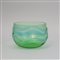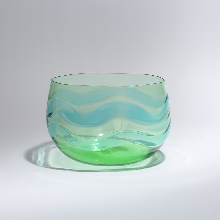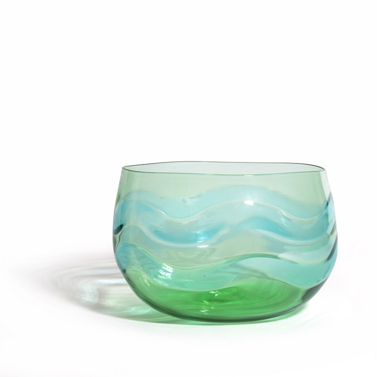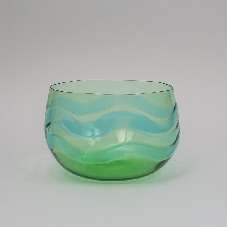 Un vaso in vetro trasparente verde chiaro decorato con due fasce ondulate in vetro azzurro circa 1930