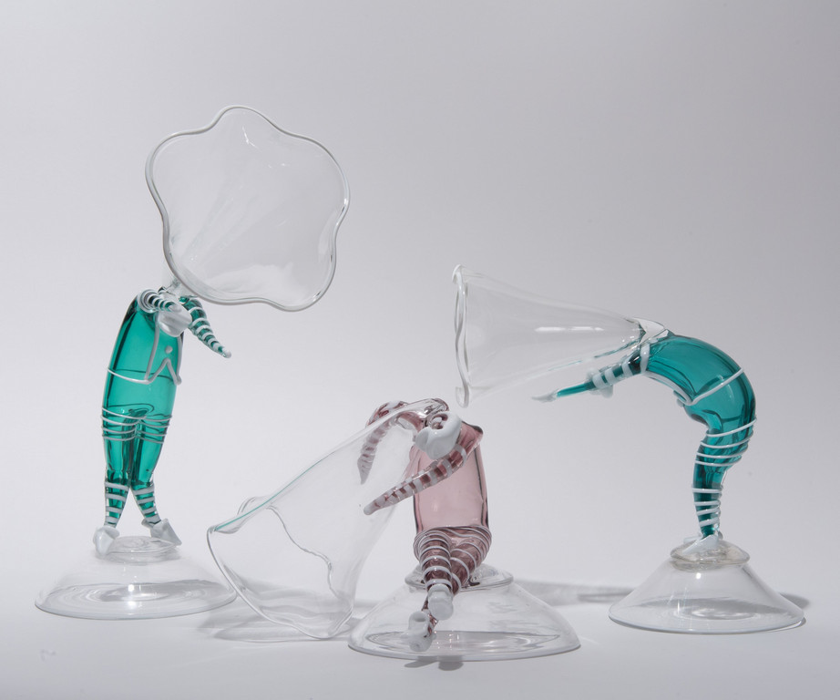 una serie di tre calici 'colpo di vento' in cristallo con gambo verde ametista trasparente modellato a figura in sequenza
