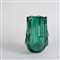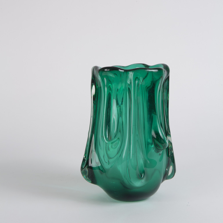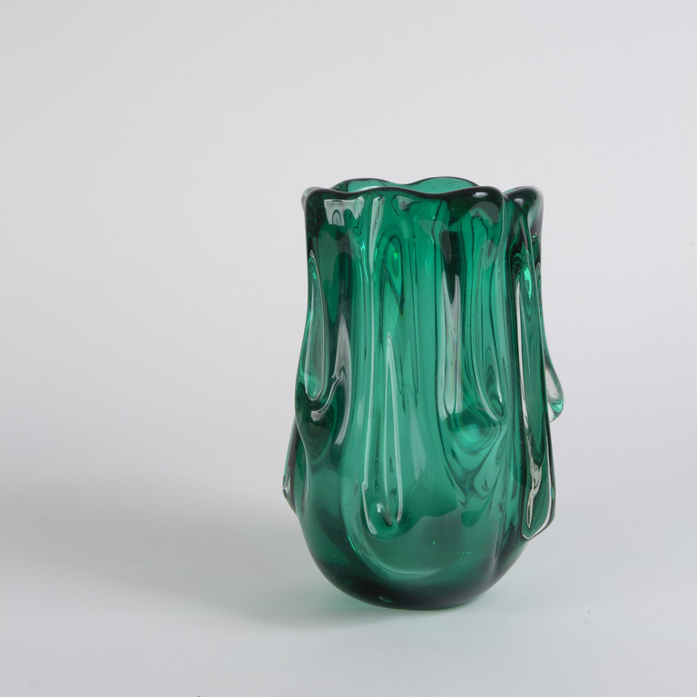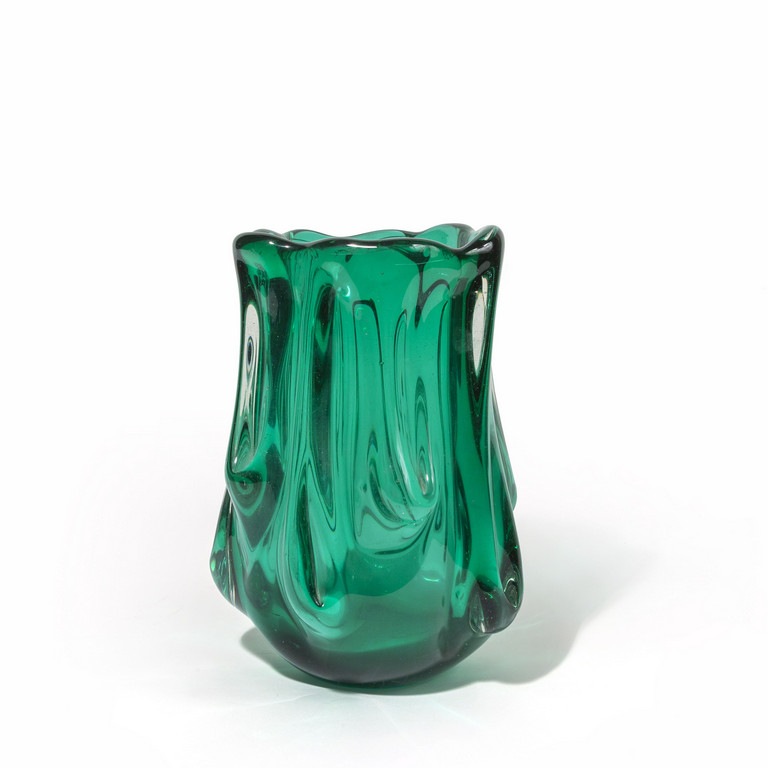 un vaso in vetro verde trasparente con rilievi ottenuti a caldo 1937