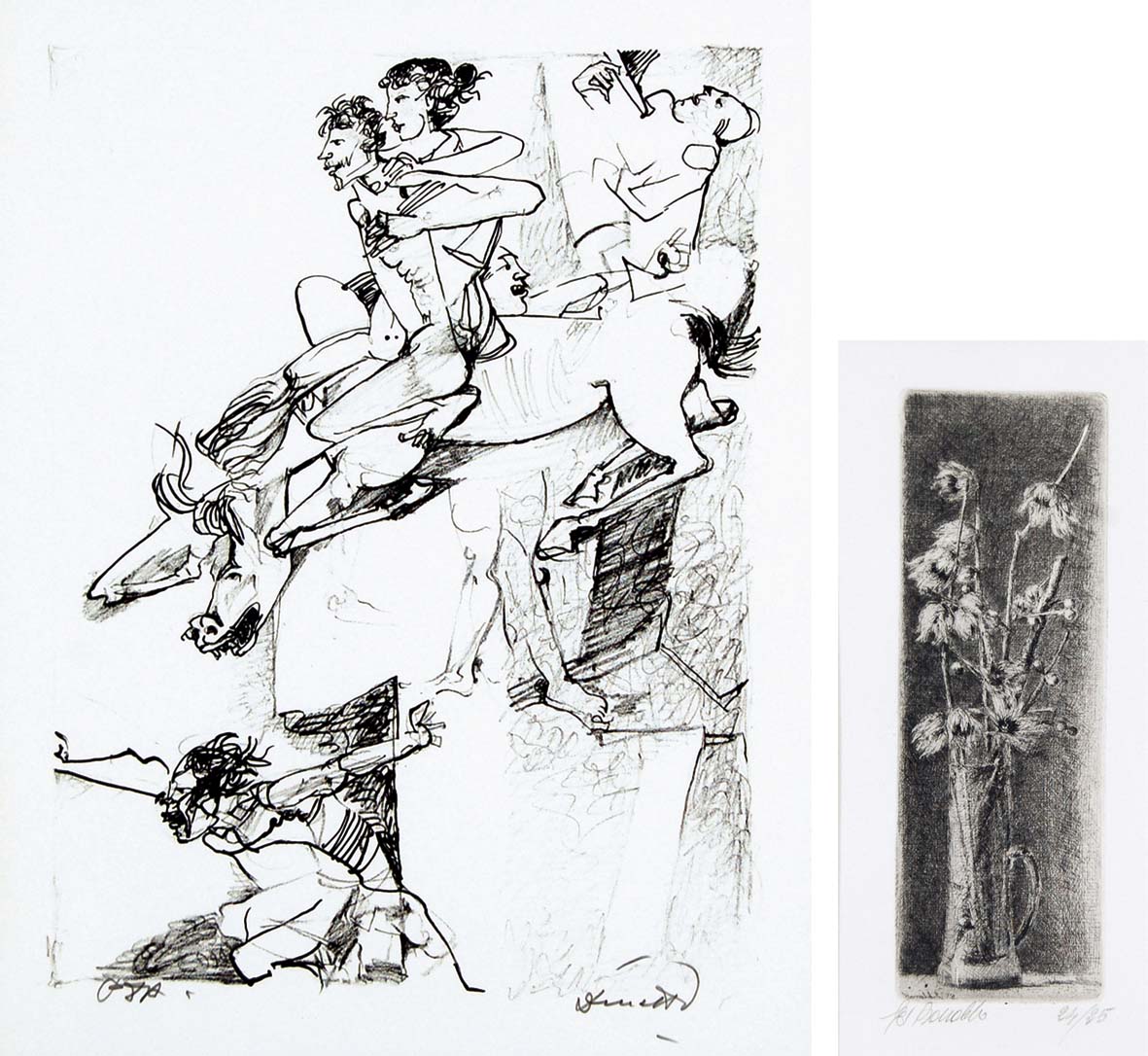 AUTORI VARI Soggetti vari lotto di 2 grafiche 35x25 - 16,5x5,5 (lastre) entrambe firmate e numerate Dinetto Lino: senza titolo, litografia es. p.d.a., firma in basso a destra tiratura in basso a sinistra Bonaldo Guerrino: Vaso di fiori, acquaforte es. 24/25, firma in basso a sinistra tiratura in basso a destra