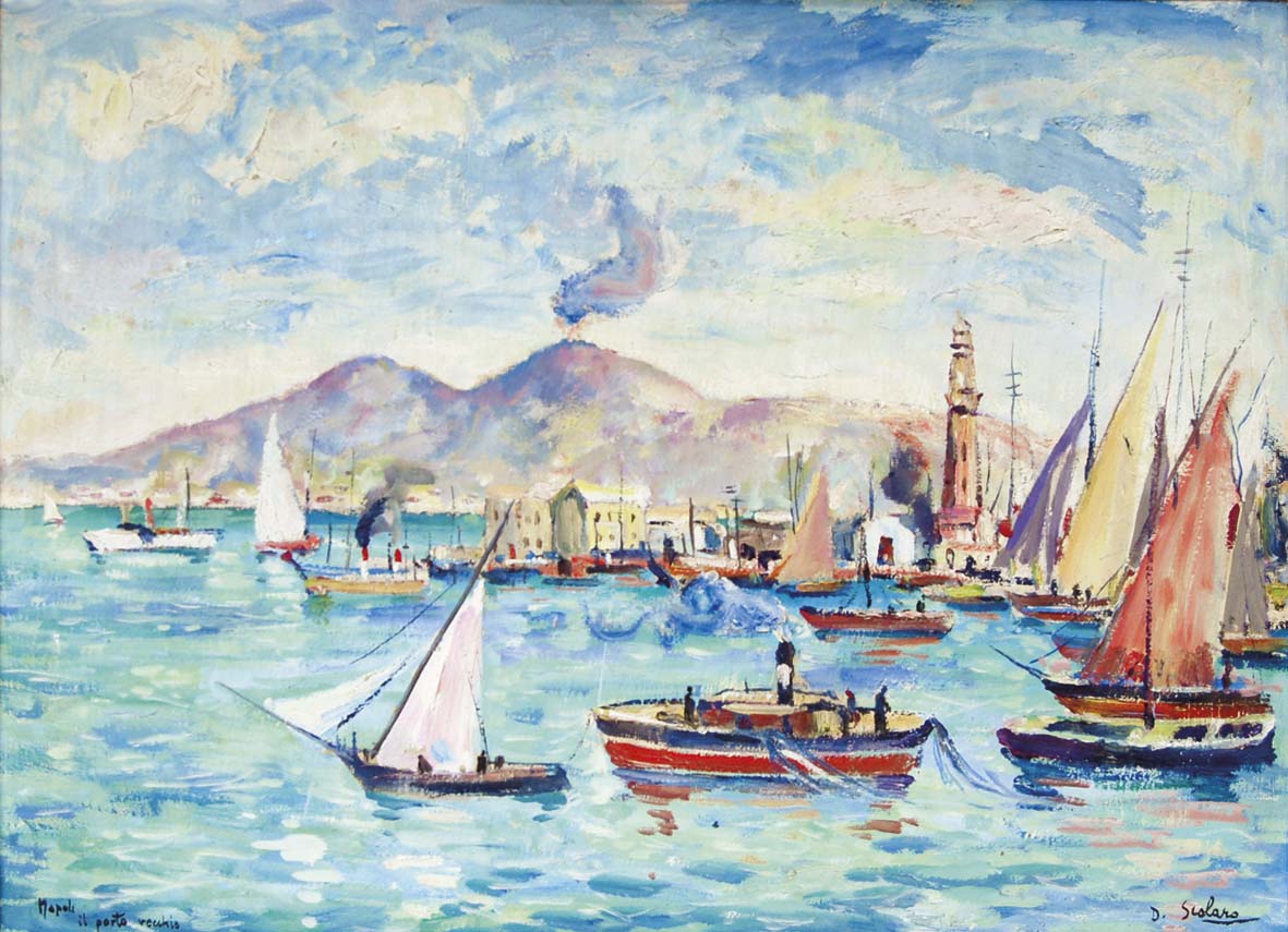 SCOLARO DOMENICO Arzignano 1951 Napoli il porto vecchio olio su tavola 60x80 firma in basso a destra titolo in basso a sinistra