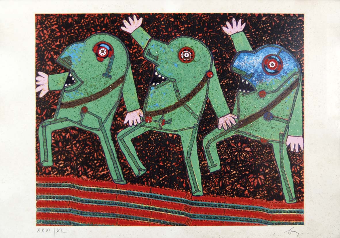 BAJ ENRICO Milano 1924 - Varese 2003 Generali litografia polimaterica es. XXVI/XL 70x100 firma in basso a destra tiratura in basso a sinistra la carta presenta fluorescenze