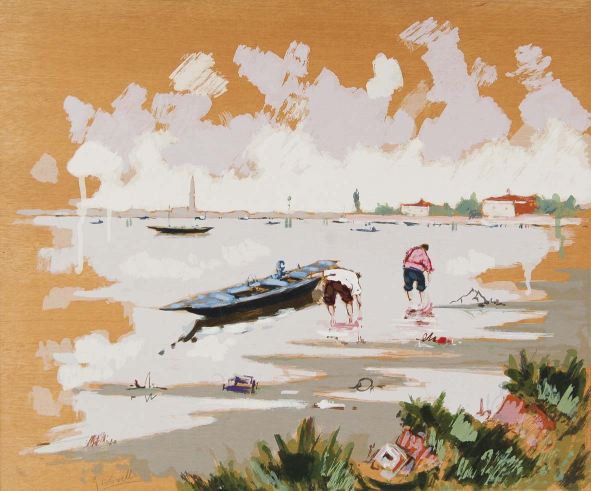 NOVELLO GIANCARLO Burano 1945 Pescatori a Burano olio su tavola 50x60 firma...