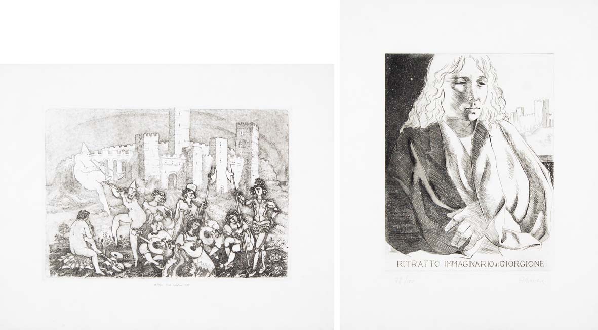 AUTORI VARI Soggetti vari lotto di 2 acqueforti es. 78/100 25x35 - 32x24 entrambi firmati e numerati in basso Vico Calabrò: Suonatori 1978 Mario Albanese: Ritratto immaginario di Giorgione