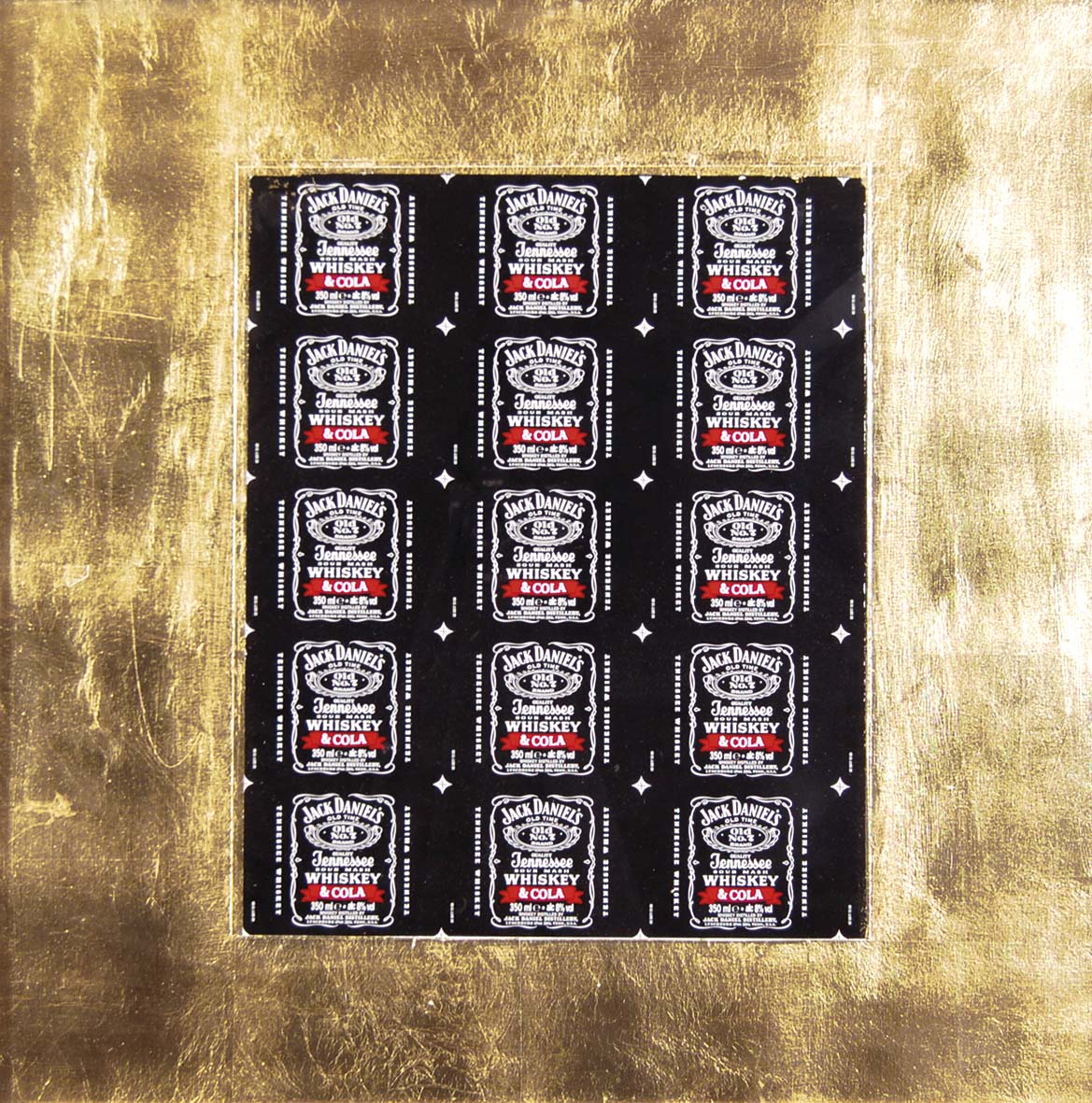CERTI MAX Martigny (Svizzera) 1977 Jack Daniel's 2011 foglia similoro e e tichette originali su tela 60x60 firma data e titolo al retro Autentica dell'Autore su foto
