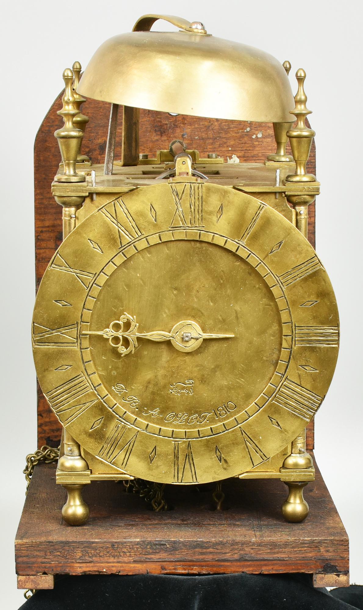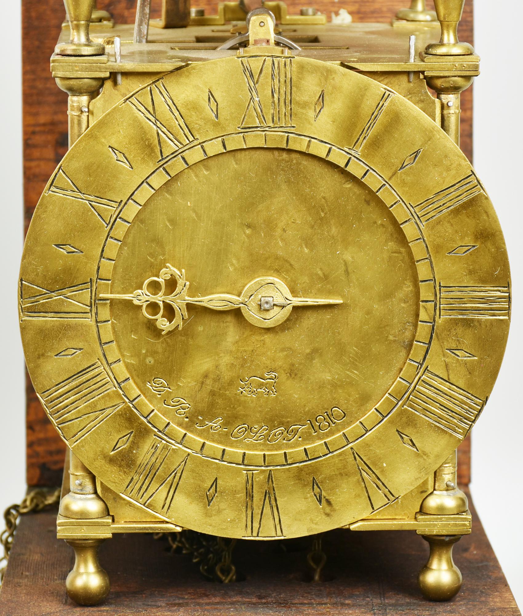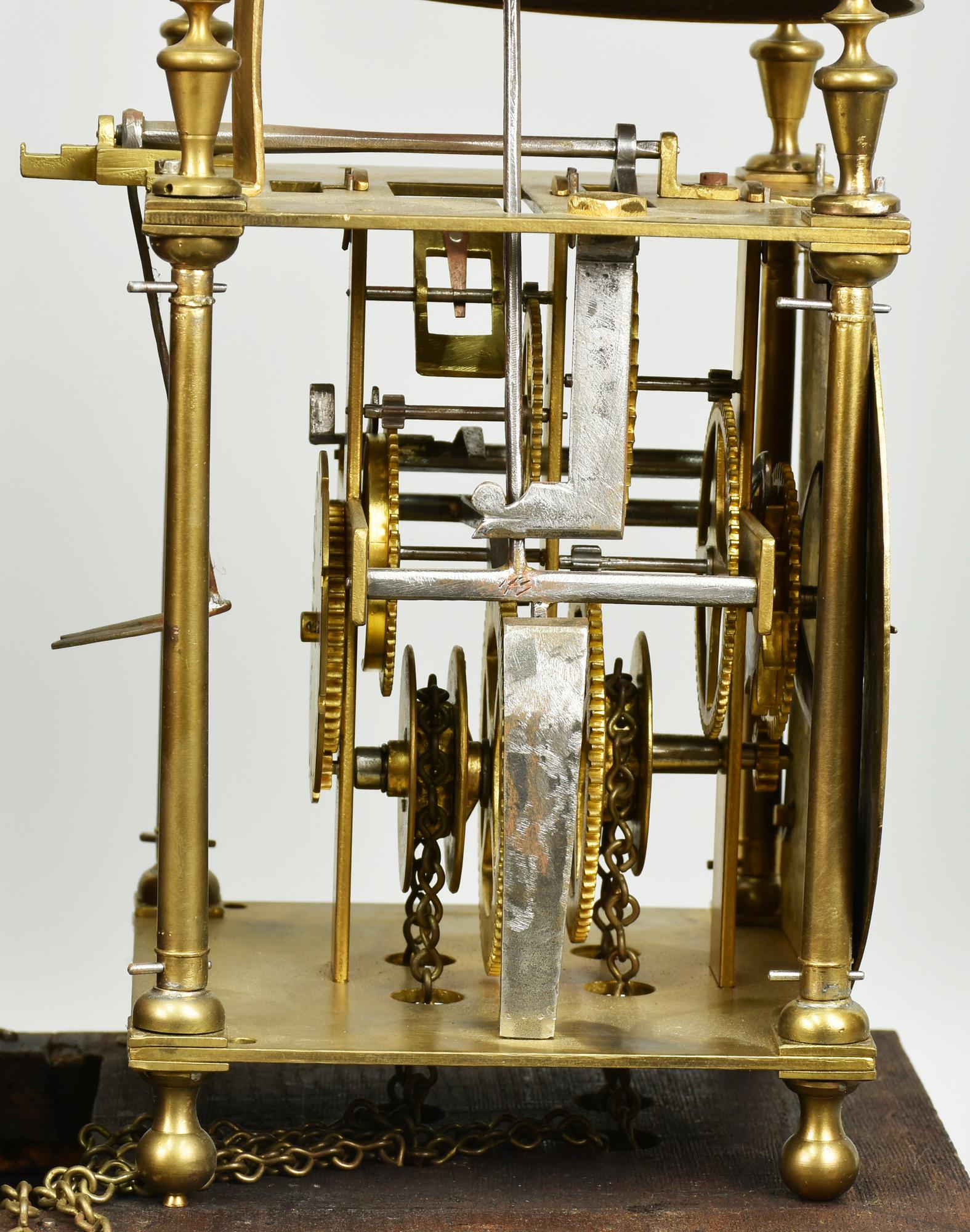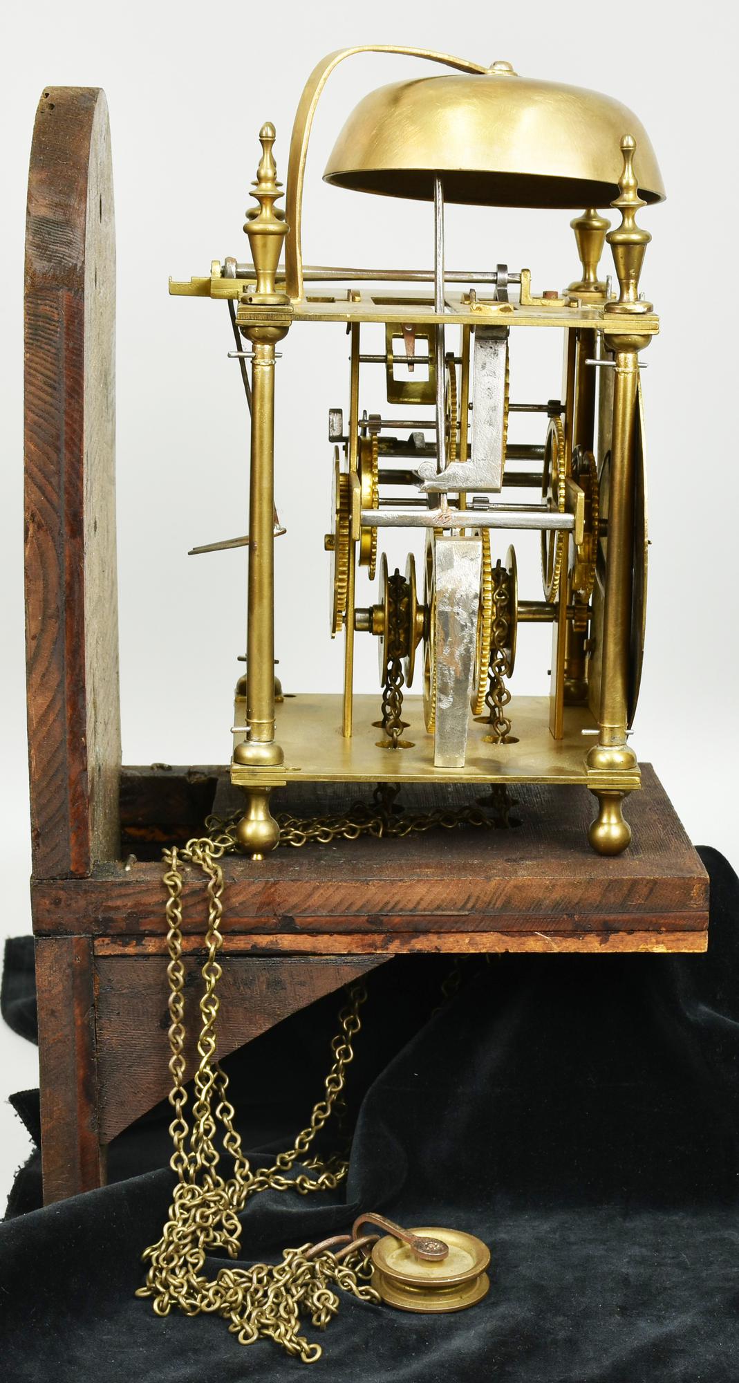 orologio a lanterna in ottone con base in legno, movimento a monolancetta con tiraggio a catene, campana in bronzo con suoneria delle ore a passaggio, scappamento ad ancora di Graham