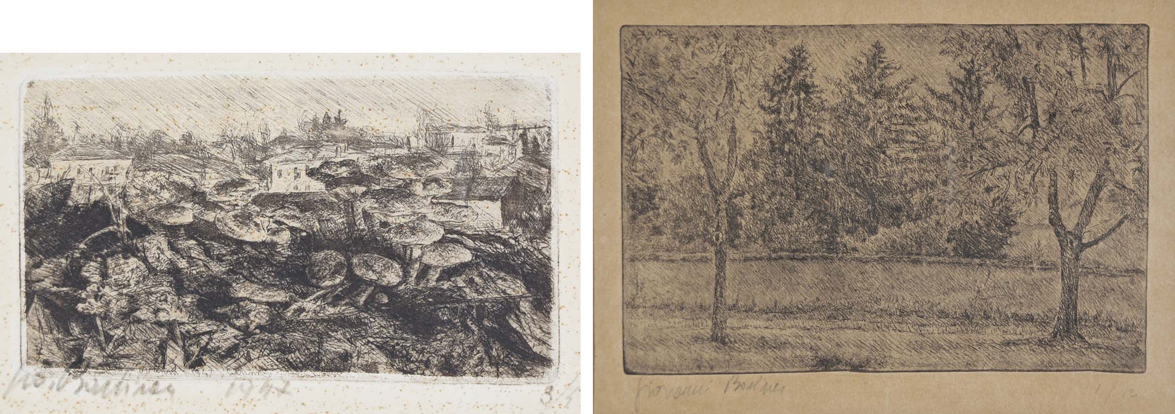 BARBISAN GIOVANNI Treviso 1914 - 1988 Funghi e paesaggio 1947 - Paesaggio (anni '40) lotto di 2 acqueforti 10,5x17 - 14,7x22,3 (lastre) Esposizioni: Galleria d'Arte Moderna San Giorgio Mestre - etichetta al retro su entrambe Funghi e paesaggio 1947: es. 3/5 firma data e tiratura in basso Paesaggio (anni '40): es. 1/12 firma e tiratura in basso