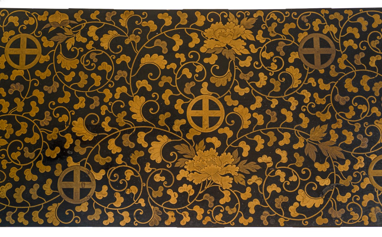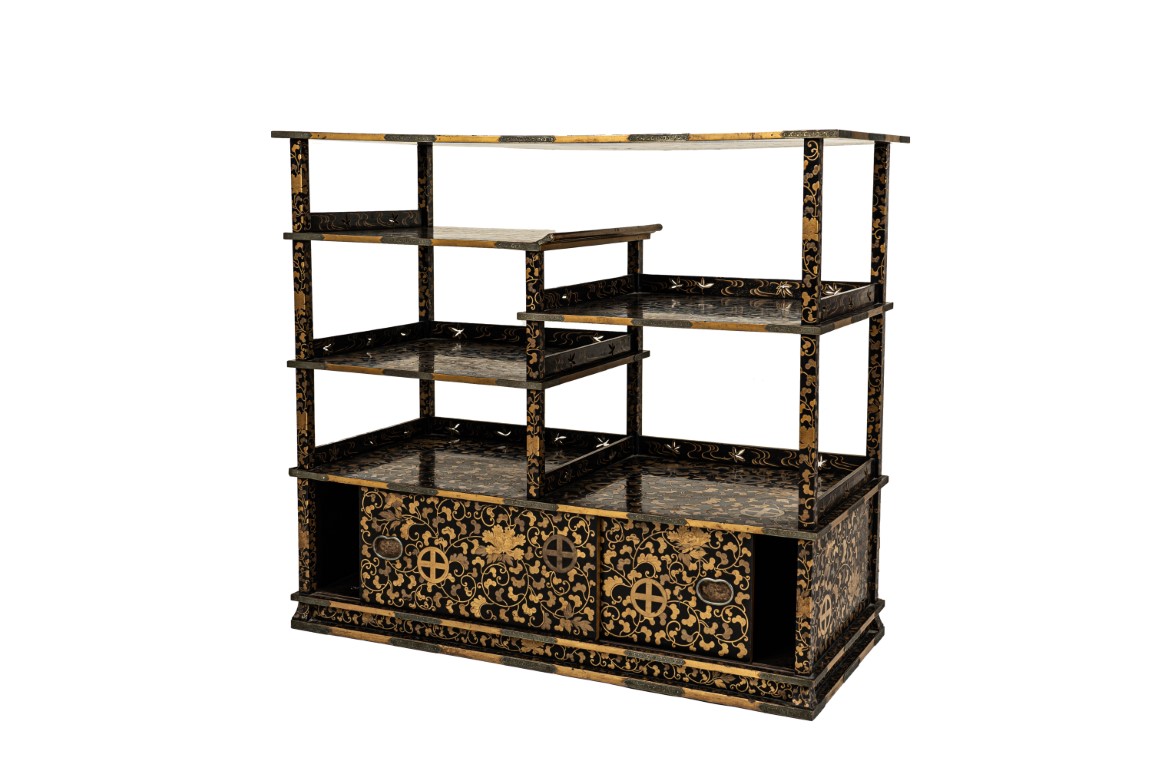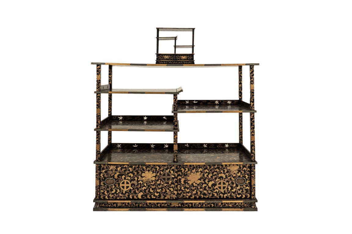 in legno laccato e dorato a decori vegetali e stemmi a croce (Kamon Satsuma) corredata di etagere in miniatura