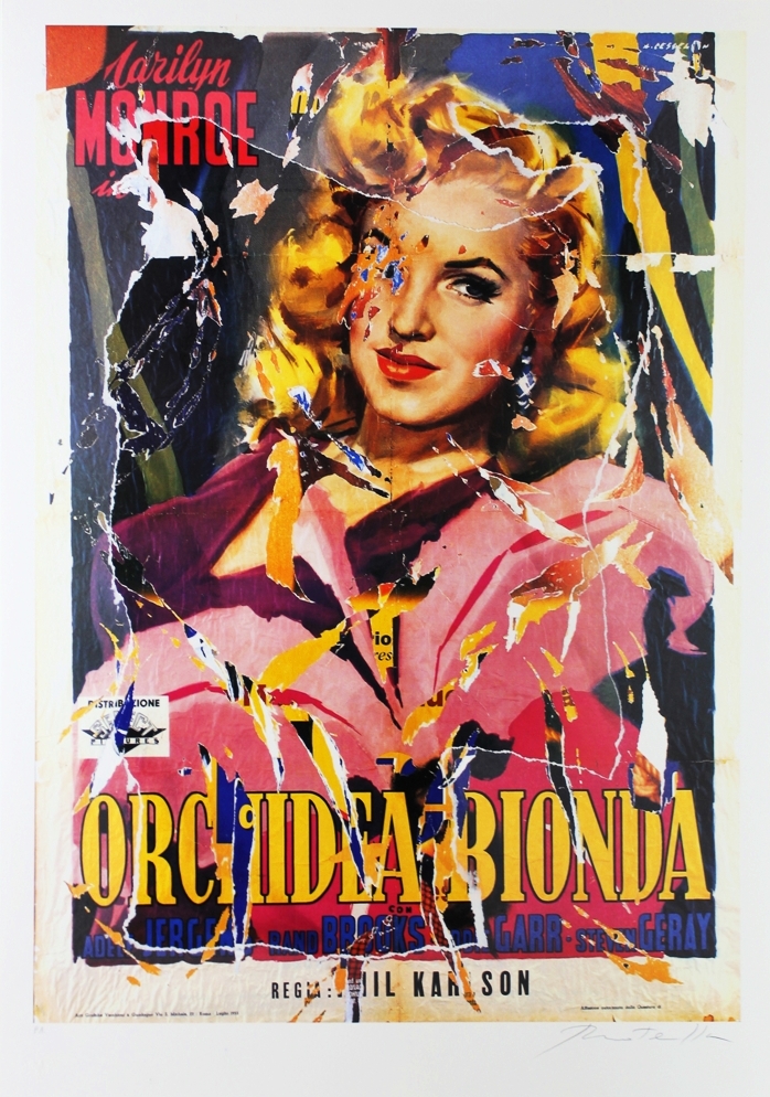 ROTELLA MIMMO Catanzaro 1918 - Milano 2006 "Orchidea bionda" Multiplo, decollage, strappi di manifesto su supporto serigrafico su cartoncino cm 70x100. Firmato sul fronte in basso a destra, tiratura P.A. a sinistra. Opera pubblicata sul catalogo "Mimmo Rotella multiplo decollage" Silvana editore.
