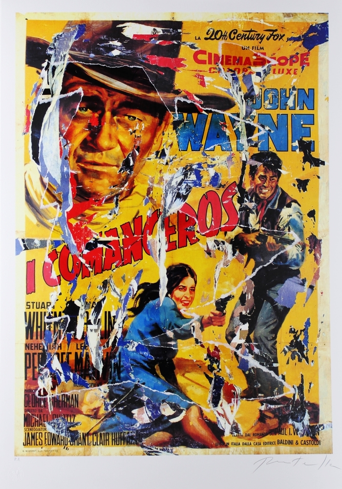 ROTELLA MIMMO Catanzaro 1918 - Milano 2006 "I comanceros" Multiplo, decollage, strappi di manifesto su supporto serigrafico su cartoncino cm 70x100. Firmato sul fronte in basso a destra, tiratura P.A. a sinistra. Opera pubblicata sul catalogo "Mimmo Rotella multiplo decollage" Silvana editore.