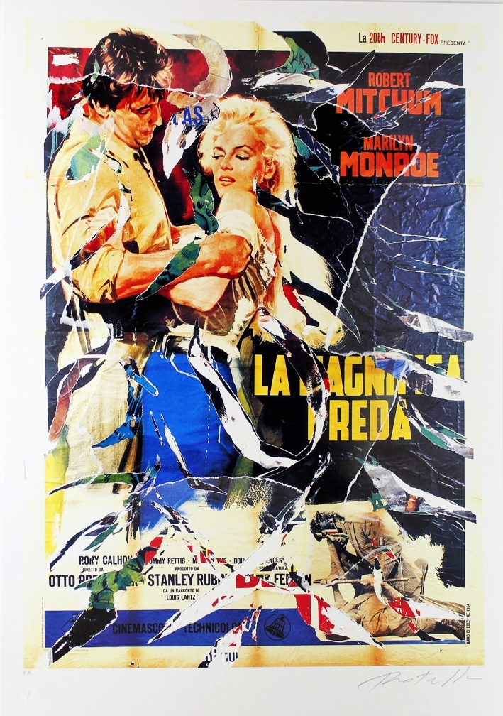 ROTELLA MIMMO Catanzaro 1918 - Milano 2006 "La magnifica preda" Multiplo, decollage, strappi di manifesto su supporto serigrafico su cartoncino cm 70x100 del 2000/2009. Firmato sul fronte in basso a destra, tiratura P.A. a sinistra. Opera pubblicata sul catalogo "Mimmo Rotella multiplo decollage" Silvana editore.