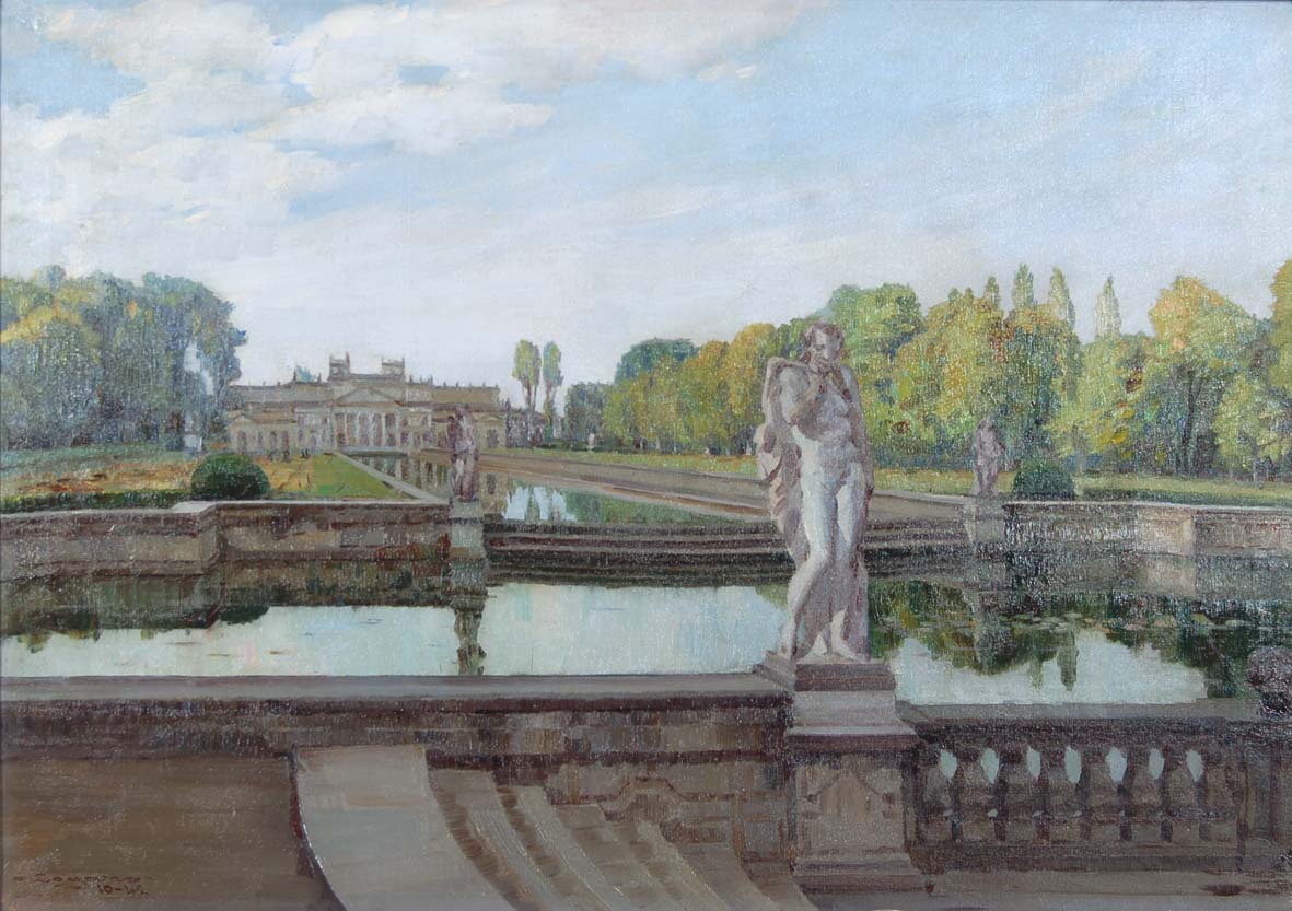 SOGARO OSCAR Dolo 1888 - Venezia 1967 Villa Pisani Strà: la scuderia e la vasca 1942 olio su tela 70x100 firma e data in basso a sinistra titolo al retro