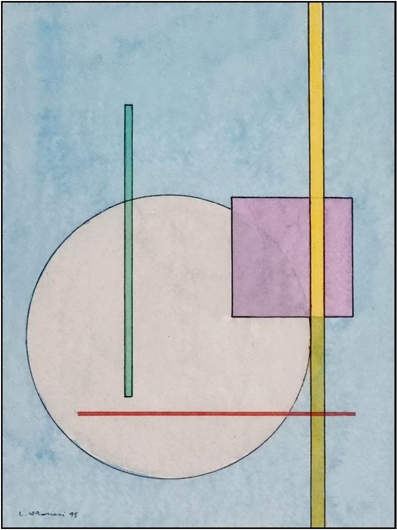 VERONESI LUIGI Milano 1908 - 1998 "Senza titolo" Acquerello e tecnica mista su cartoncino cm 24x30 del 1995. Firmato e datato sul fronte in basso a sinistra. Autentica su foto a cura dell'artista, in data 1996 e lettera di accompagnamento della stamperia "Dell'Arancio" a firma di Riccardo Lupo. Opera incorniciata.